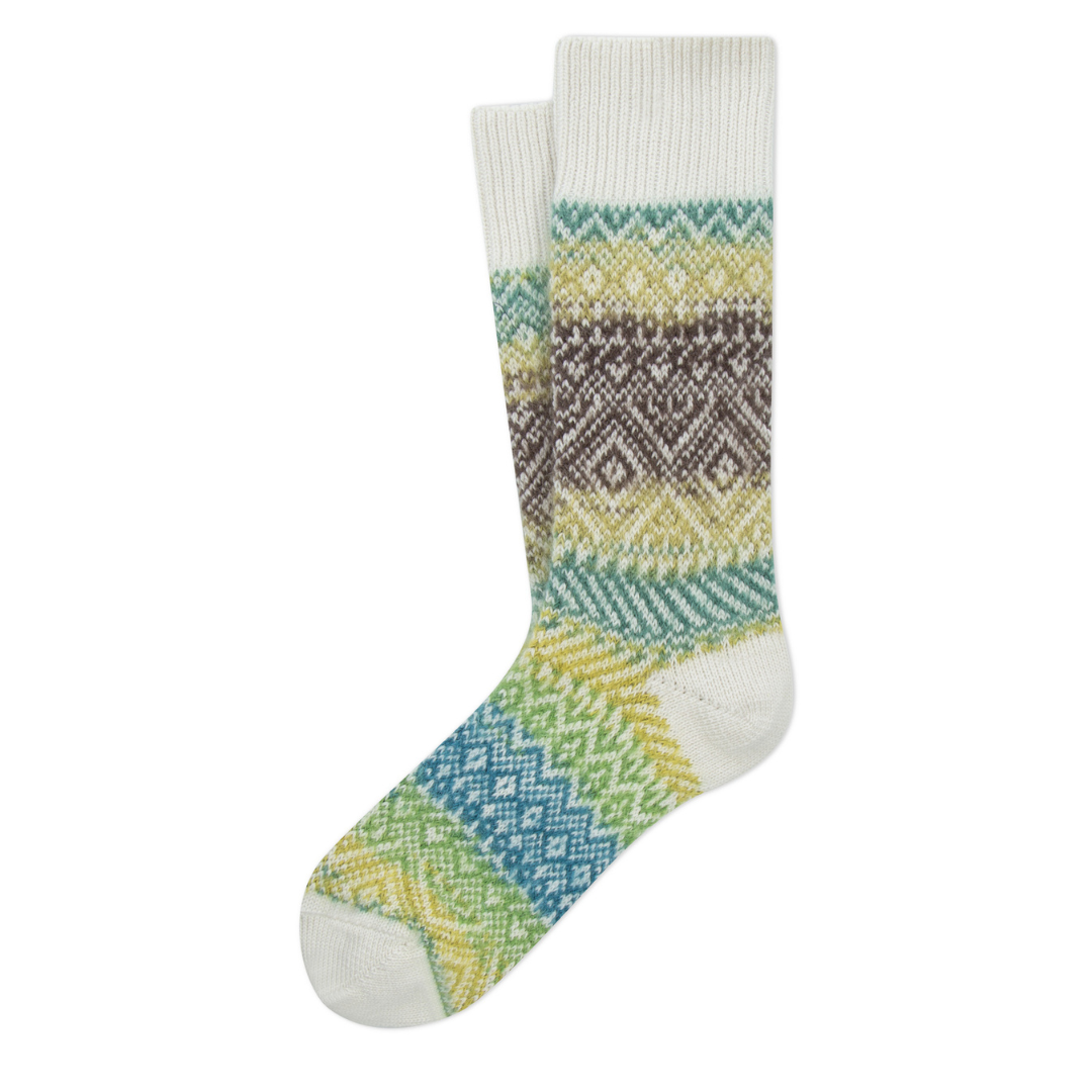 Short socks in printed cotton and mohair, Aztec design and reinforced and contrasting toe and heel.