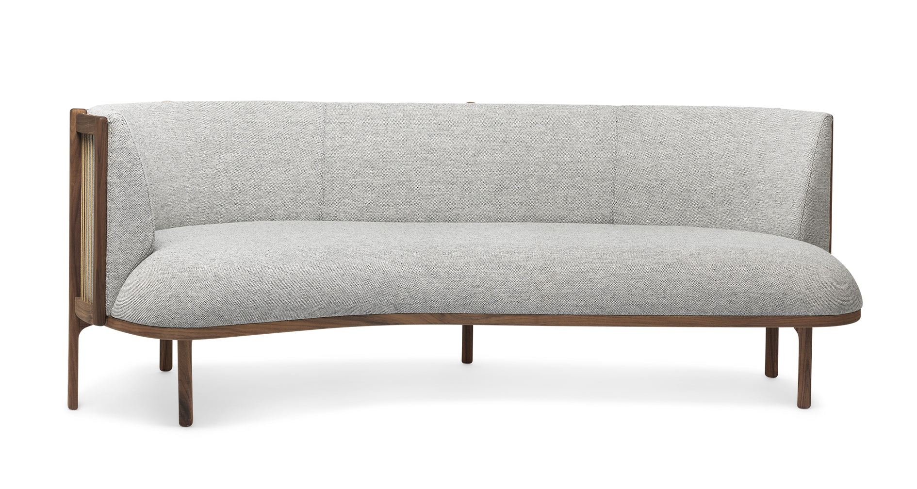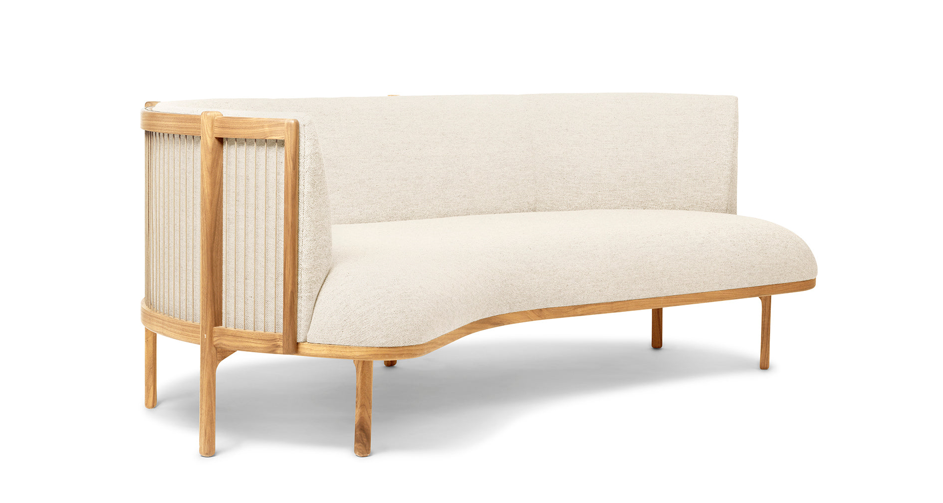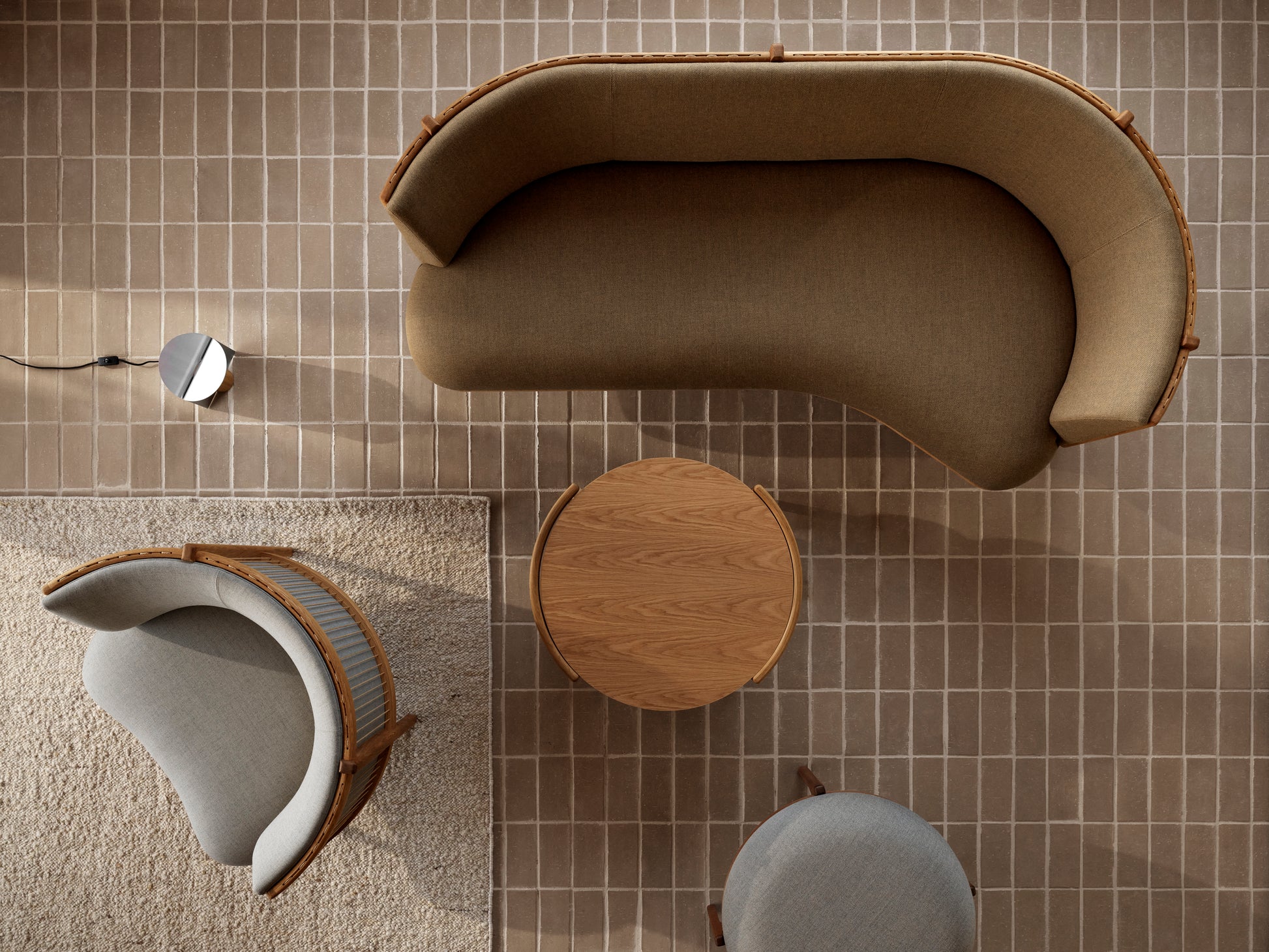 The Sideways Sofa from Rikke Frost combines classic materials – wood, paper cord, and high-quality upholstery textile – with a modern asymmetric shape. The steam-bent backrest is shaped from solid wood and woven paper cord for a light, elegant expression, while the seat and back are padded and upholstered for optimal comfort. The result is a sofa you want to sit in for a long time.
