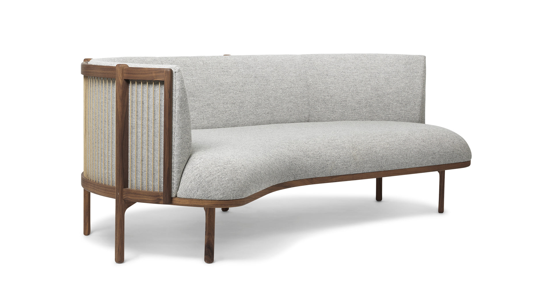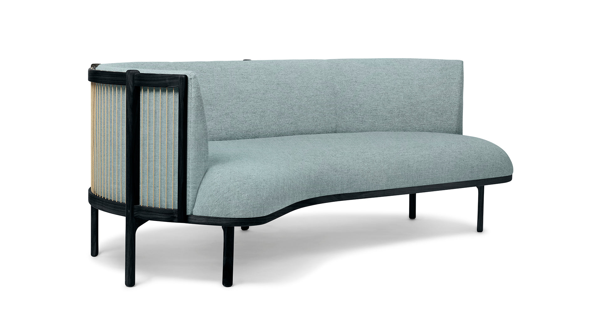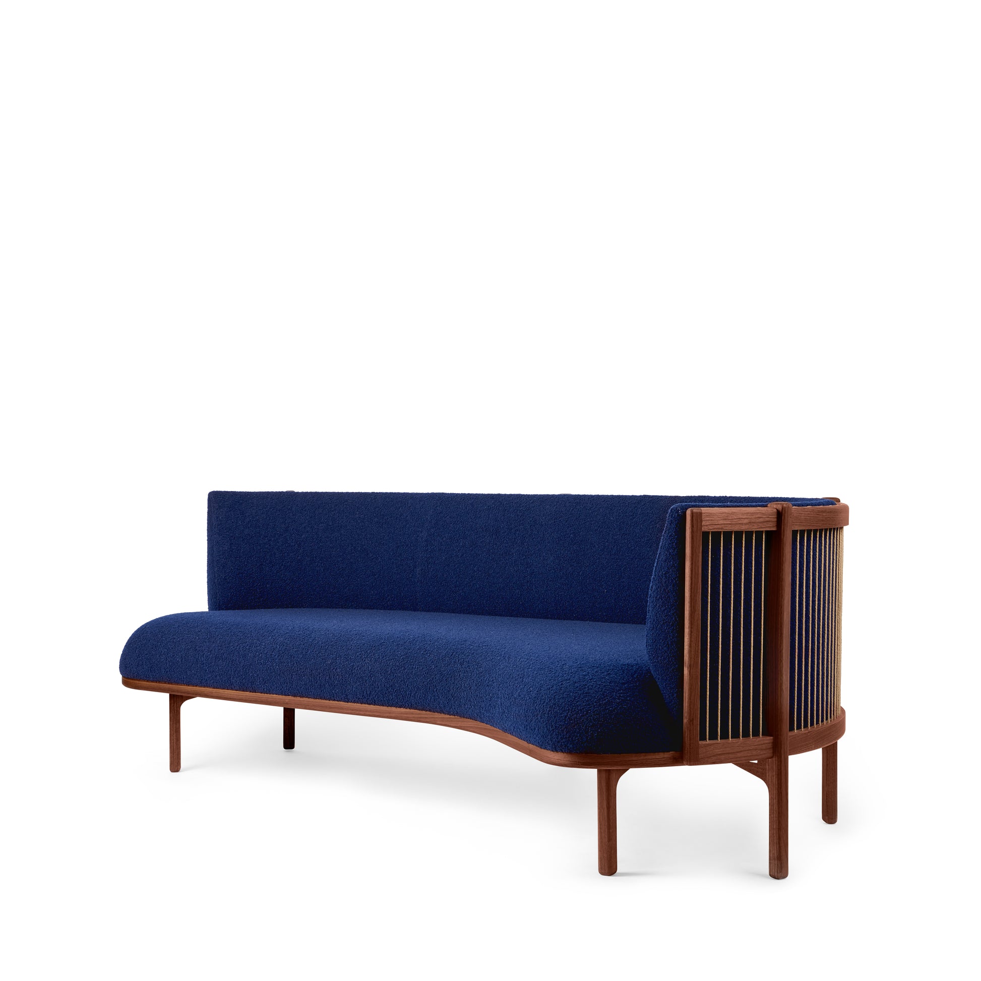 The Sideways Sofa from Rikke Frost combines classic materials – wood, paper cord, and high-quality upholstery textile – with a modern asymmetric shape. The steam-bent backrest is shaped from solid wood and woven paper cord for a light, elegant expression, while the seat and back are padded and upholstered for optimal comfort. The result is a sofa you want to sit in for a long time.