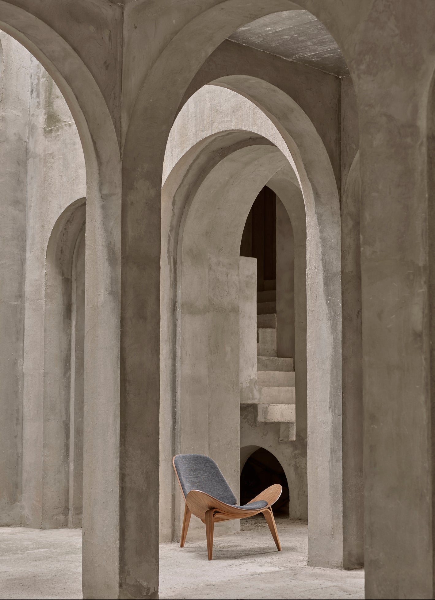 Hans J. Wegner’s architectural expertise and absolute determination creates the ultimate sense of proportion and balance. The design’s floating lightness is achieved through its wing-like seat and three arched legs. The chair’s signature seat, backrest and legs are created from form-pressed veneer and upholstery, cradling the user in generous comfort. The chair’s front legs are made from a single piece, and all three legs splitting at their highest point, before coming back together and curving sharply downwards. This unique construction adds stability to the light and distinctive form.