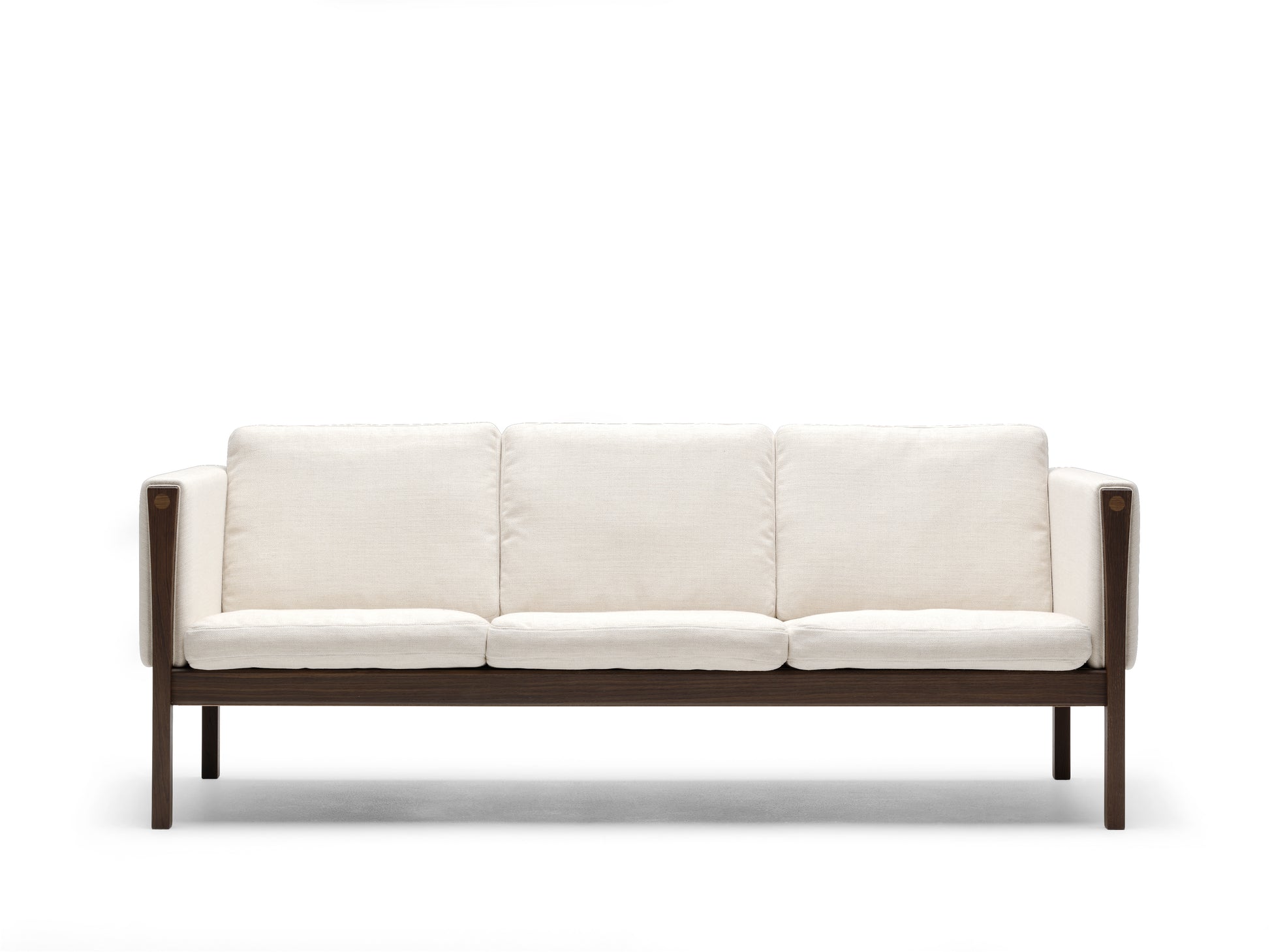 The sofa’s solid wooden frame is firmly upholstered. The cushions in the seat and back are loose and soften the otherwise straight lines of the sofa. The idea of using down wrapping a foam core in a sofa enabled Wegner to add pleasant comfort to a mostly tight form.