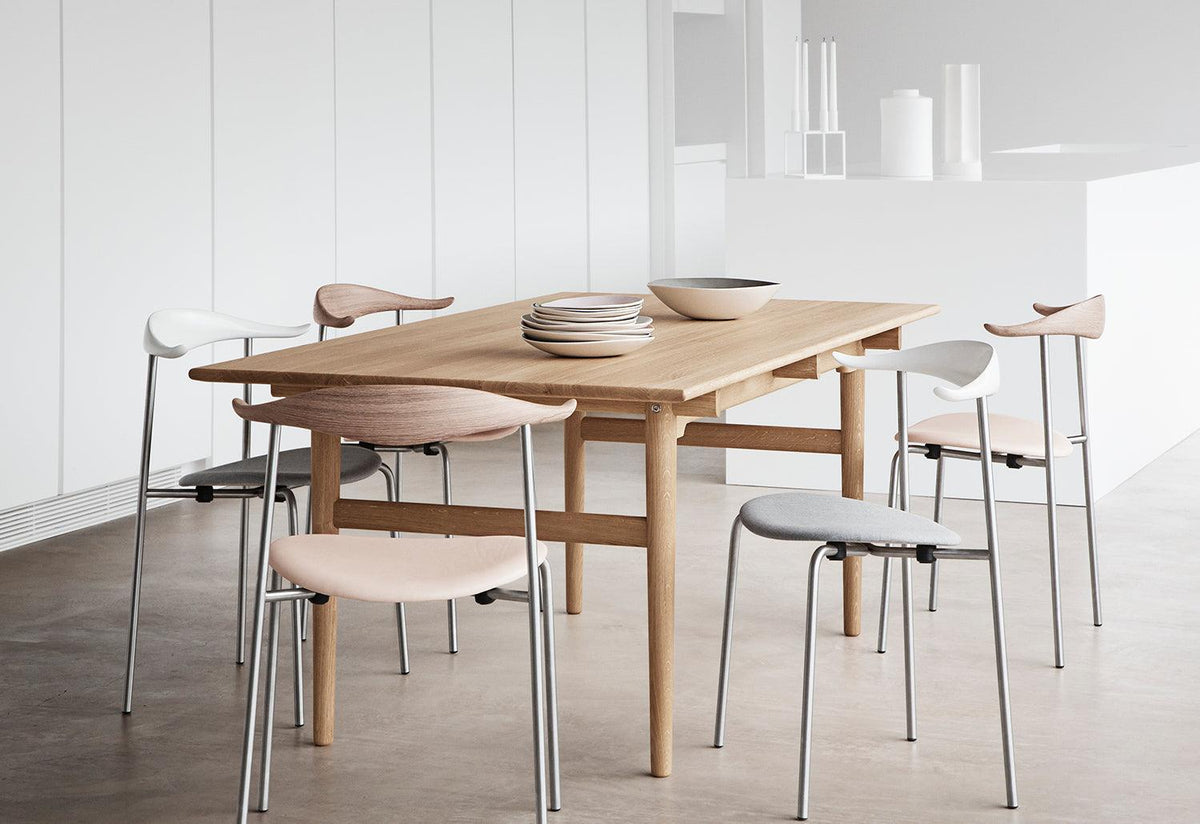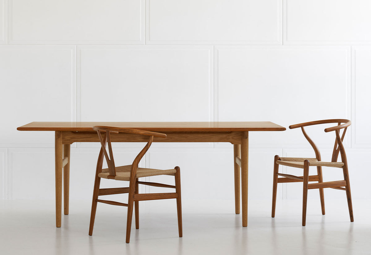 CH327 is available today in two lengths: 190 cm for six people and 248 cm for eight people. Both tables can be extended at each end with a 40 cm wide extension plate, increasing the number of seats to 10 and 12.