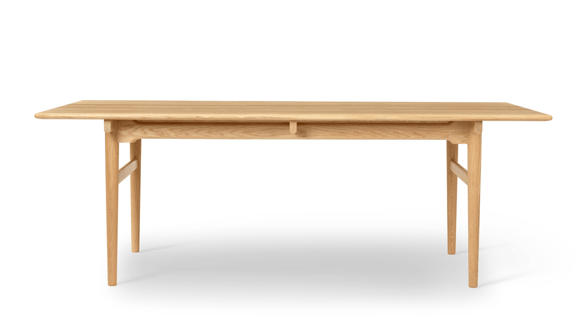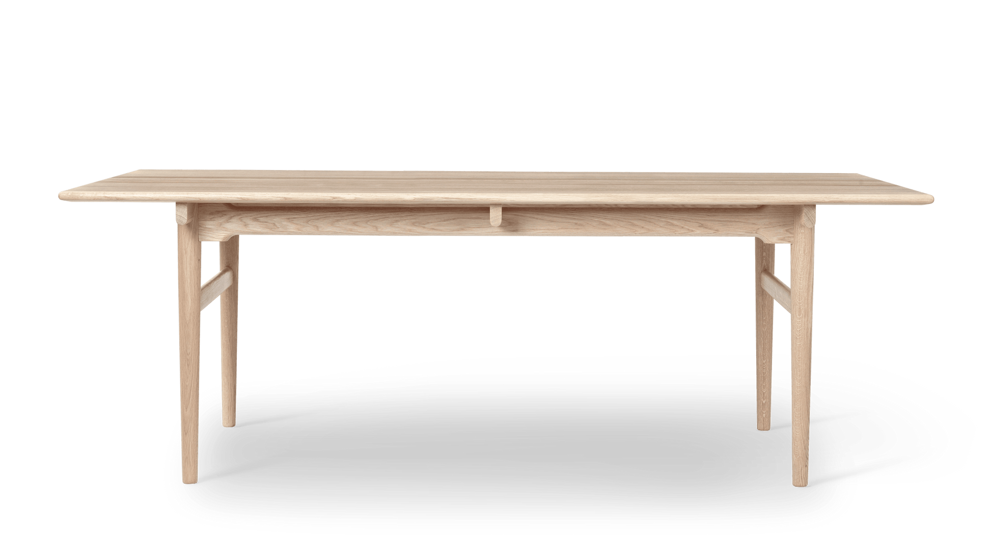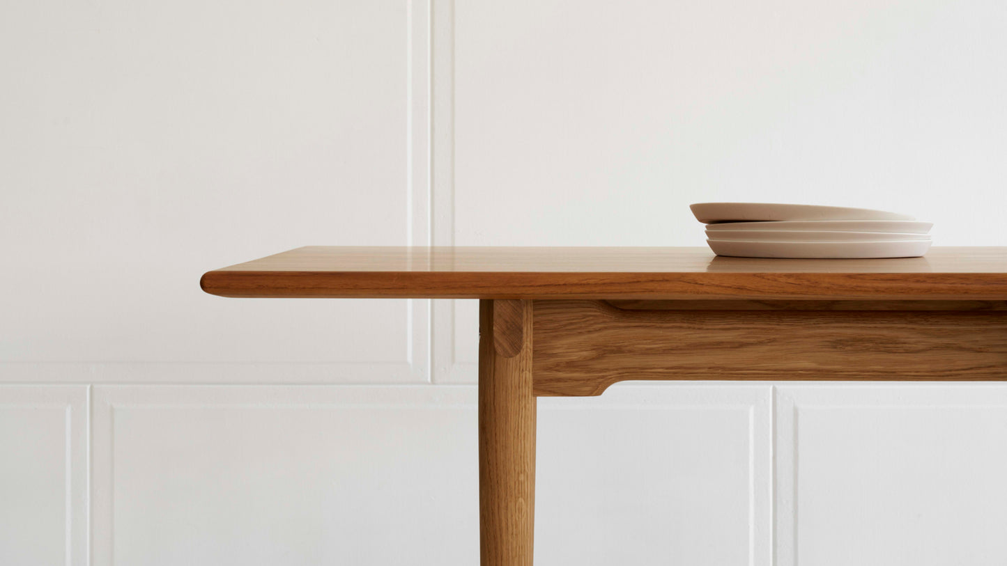 Hans J. Wegner’s CH327 dining table from 1962 is a good example of how creativity combined with excellent craftsmanship can result in a different and exciting design. CH327 is a solid wood dining table with softened edges and rounded legs that become narrower towards the floor. The wood’s grains follow the tabletop's length, which is supported by 3 distinct rails. Underneath each of these, on each side, is a side rail that continues along the length of the table. Between the side rail and the tabletop, there is a space, thus giving the impression that the tabletop is floating. For support, there are two detachable legs at each end which are connected by a cross-stretcher. The legs and stretchers ensure the stability of the table transversely while the side rails do the same in the length. The side rails are joined higher at the table legs and more narrow between them in order to increase leg space for seating.