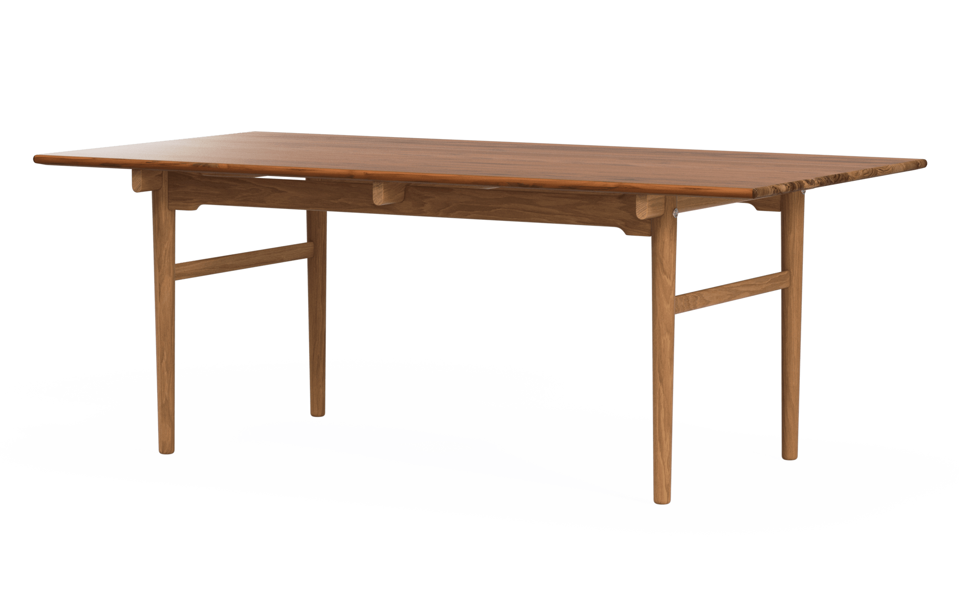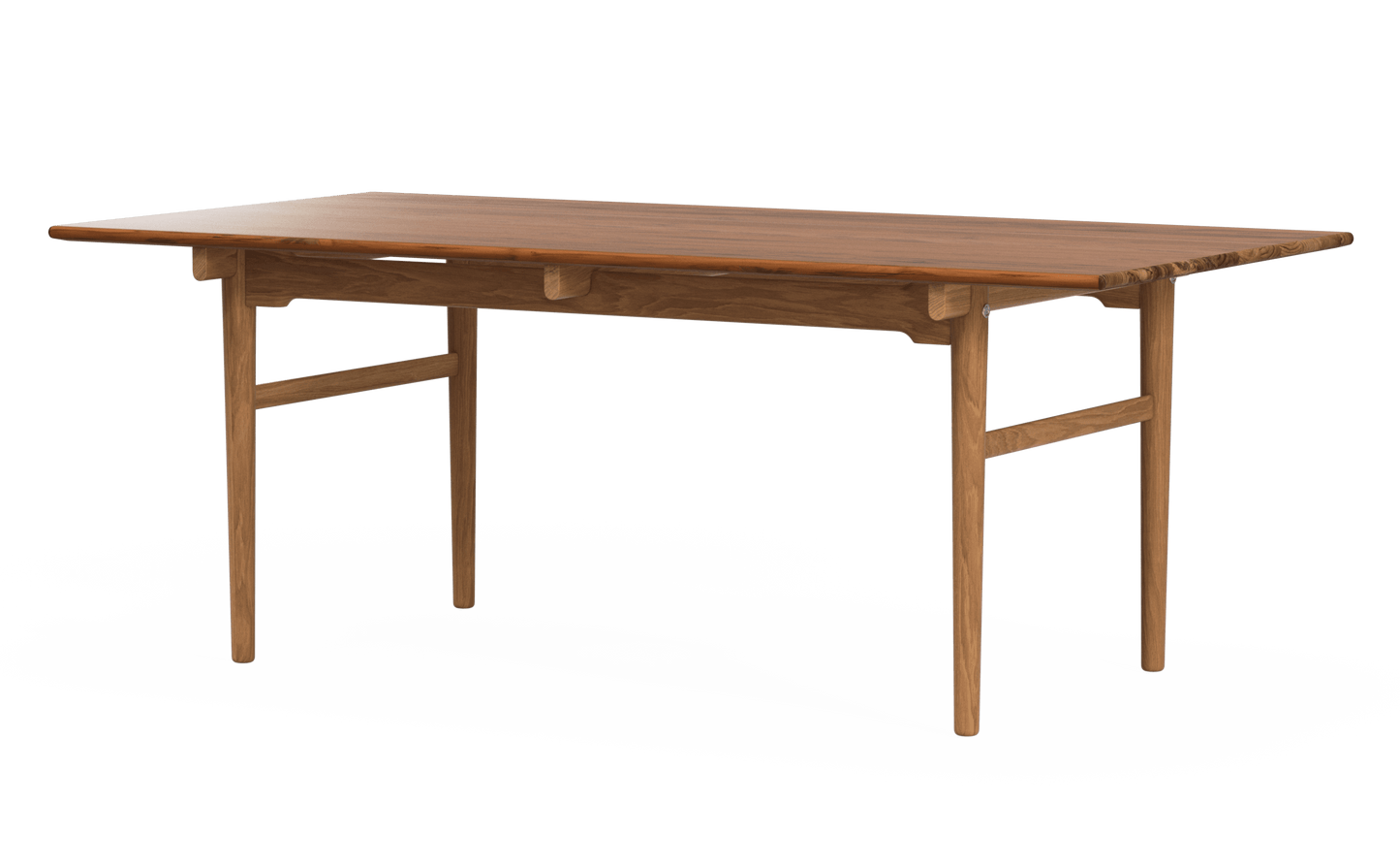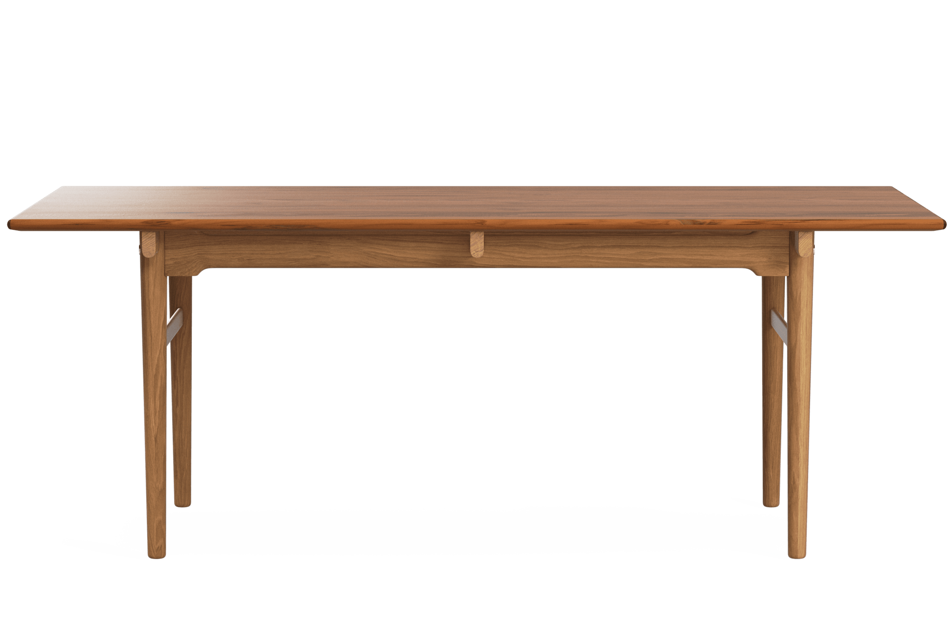 Hans J. Wegner’s CH327 dining table from 1962 is a good example of how creativity combined with excellent craftsmanship can result in a different and exciting design. CH327 is a solid wood dining table with softened edges and rounded legs that become narrower towards the floor. The wood’s grains follow the tabletop's length, which is supported by 3 distinct rails. Underneath each of these, on each side, is a side rail that continues along the length of the table. Between the side rail and the tabletop, there is a space, thus giving the impression that the tabletop is floating. For support, there are two detachable legs at each end which are connected by a cross-stretcher. The legs and stretchers ensure the stability of the table transversely while the side rails do the same in the length. The side rails are joined higher at the table legs and more narrow between them in order to increase leg space for seating.