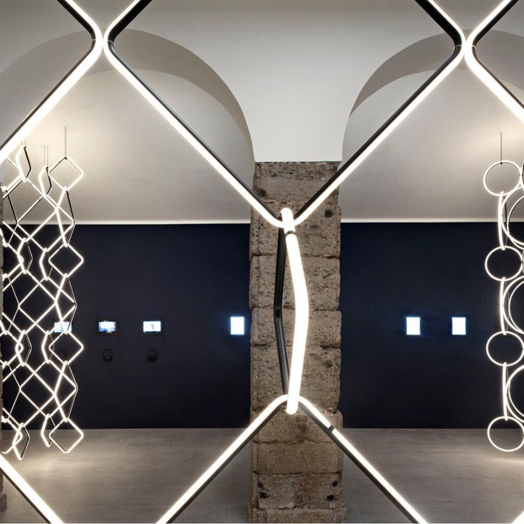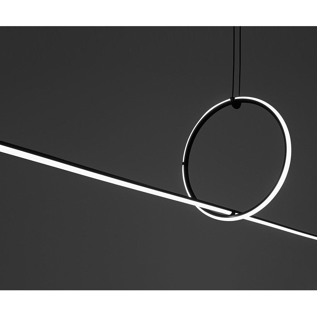 Diffuse light suspended lighting device. Body in extruded, curved NC-machined and black powder-coated aluminium, diffuser in platinum optical silicone. Each component can be connected to the power pack by means of an electrical and mechanical connection system designed for customisable product set-up.