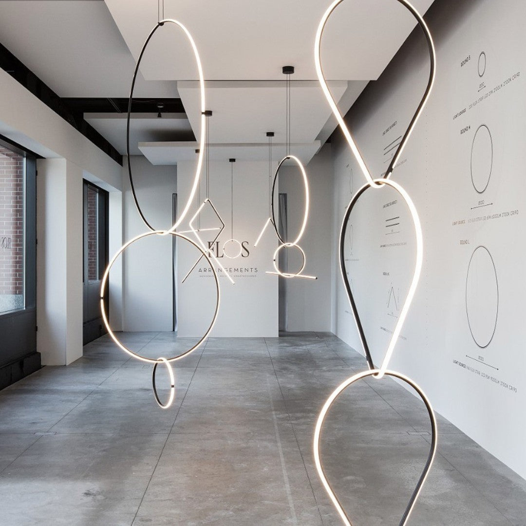 Diffuse light suspended lighting device. Body in extruded, curved NC-machined and black powder-coated aluminium, diffuser in platinum optical silicone. Each component can be connected to the power pack by means of an electrical and mechanical connection system designed for customisable product set-up.