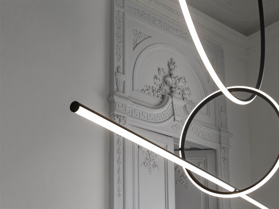 Diffuse light suspended lighting device. Body in extruded, curved NC-machined and black powder-coated aluminium, diffuser in platinum optical silicone.Each component can be connected to the power pack by means of an electrical and mechanical connection system designed for customisable product set-up.Roses available with two powers: lamp with power under 70W and lamp with power under 190W. Class III roses also available for installations with remote power supply: surface version for installations on cement, recessed version for plasterboard ceilings.The electronics integrated in the rose enables use of dimming systems: push, 1-10, potentiometer, DALI. In the absence of these systems, the light flow can be set with the push system included in the rose.Cable length 2.4m