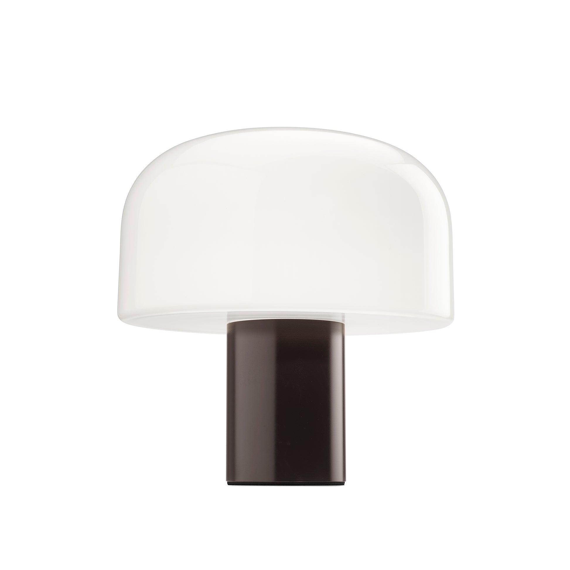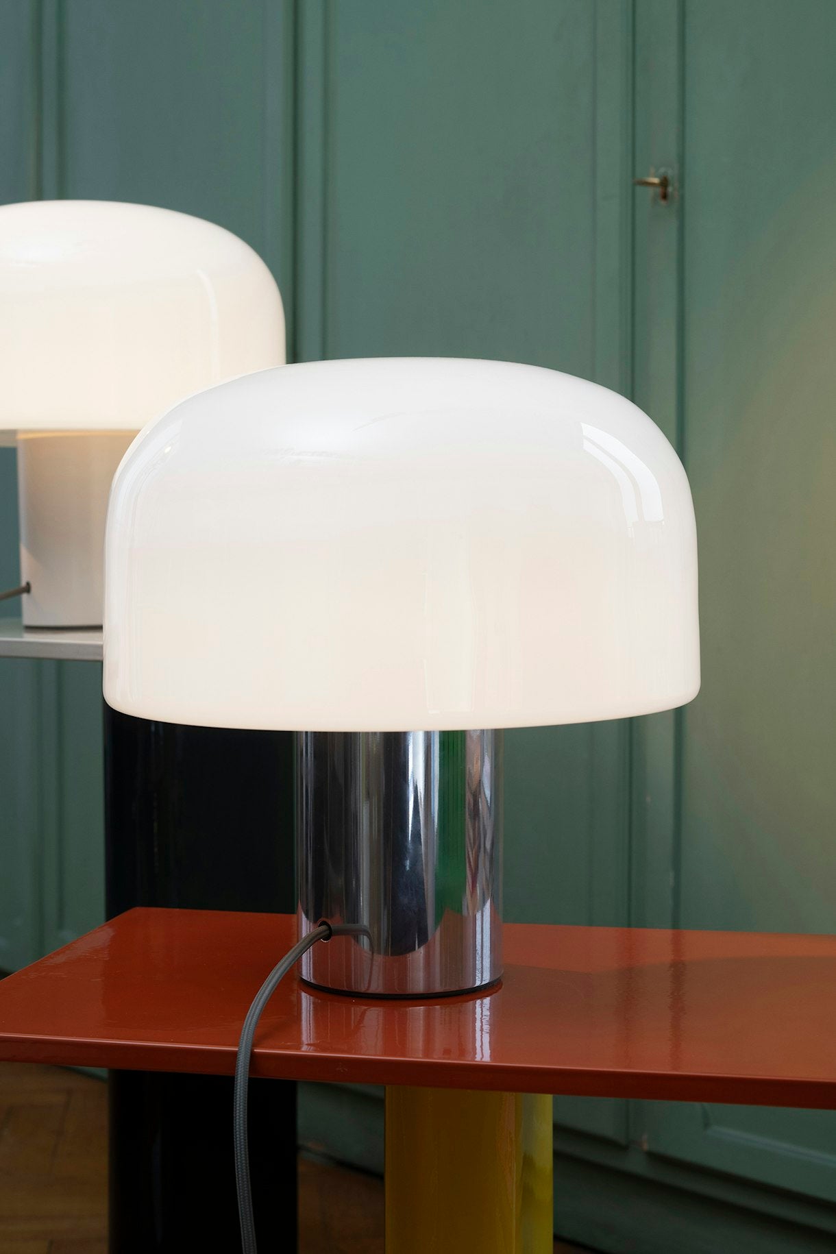 A large-scale table lamp. This design has been developed in collaboration with the Flos R&D Department. The use of triplex opaline glass and the large size, which keeps the light source at a distance from the inner surface of the diffuser, allows for uniform, warm, and welcoming lighting, creating a pleasant atmosphere in the space.