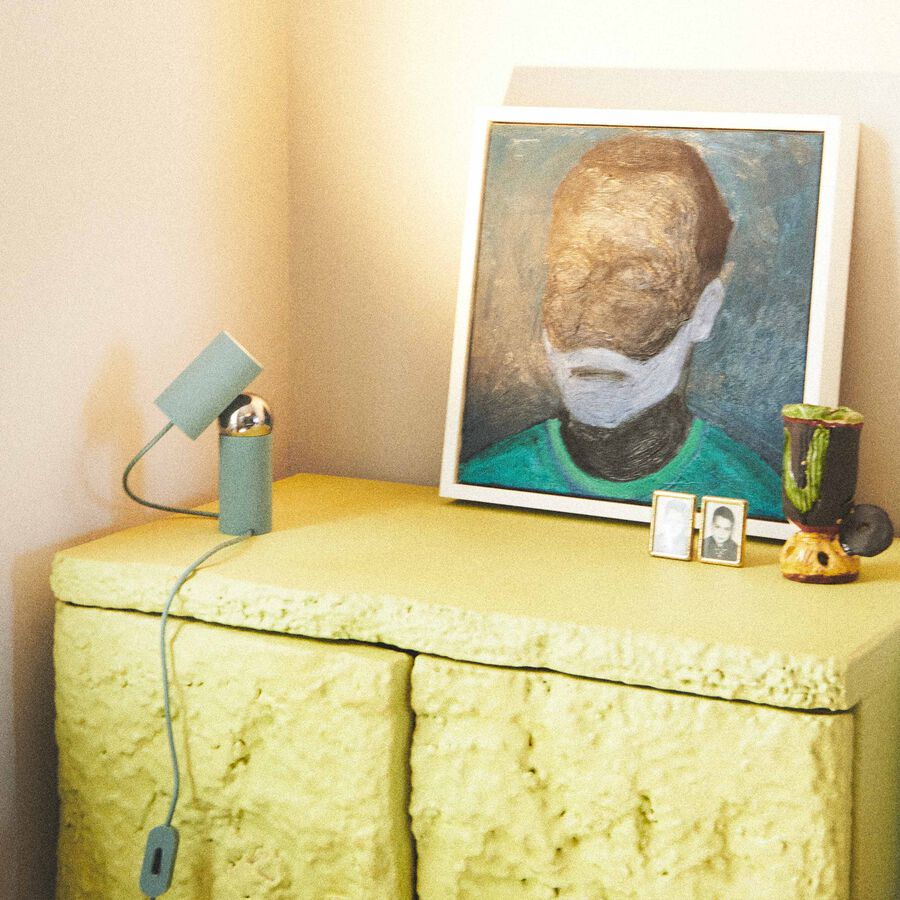 Table lamp with adjustable head. Integrated LED bulb and cut-off providing direct lighting. Body made of a special pigmented polycarbonate deriving from a by-product of paper production rather than from petroleum. Adjustability through steel sphere treated with protective layer deposited in PVD.