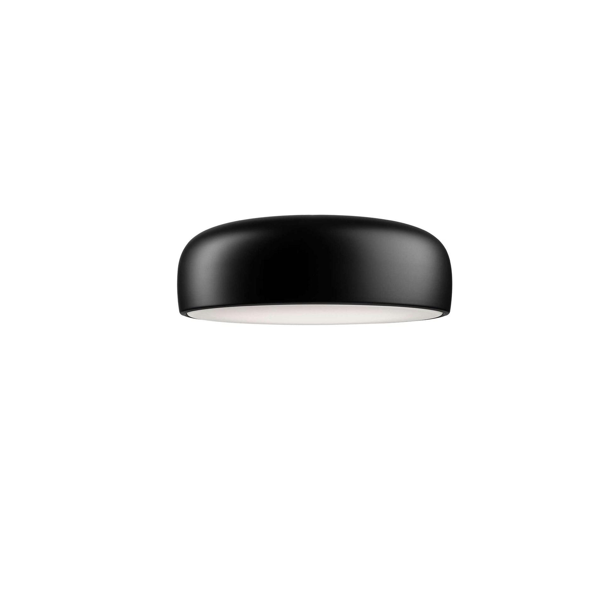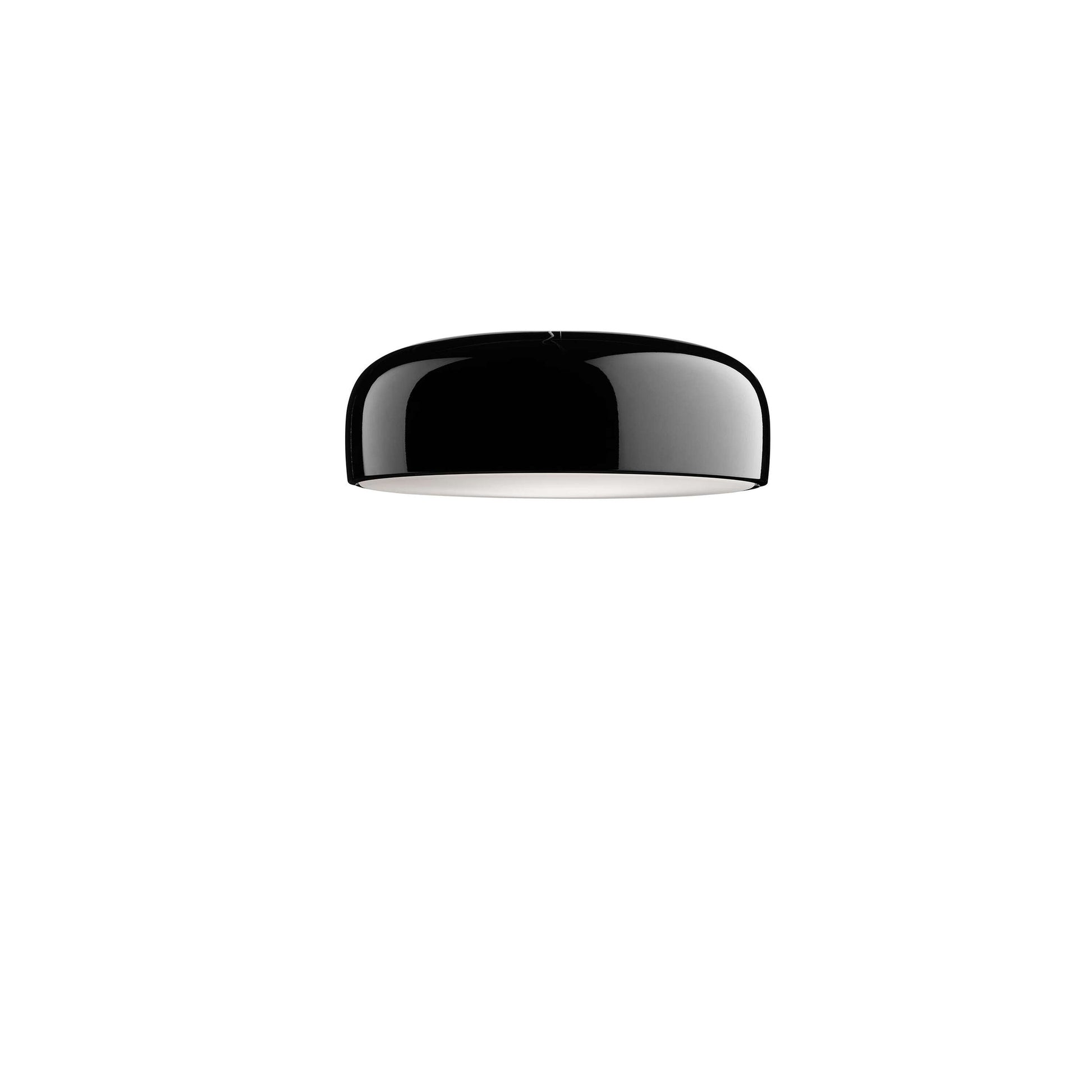 Ceiling-mounted lamp providing direct light. Aluminium body available painted gloss black or white. Injection-moulded opalescent polycarbonate diffuser. Steel wall and ceiling attachment.