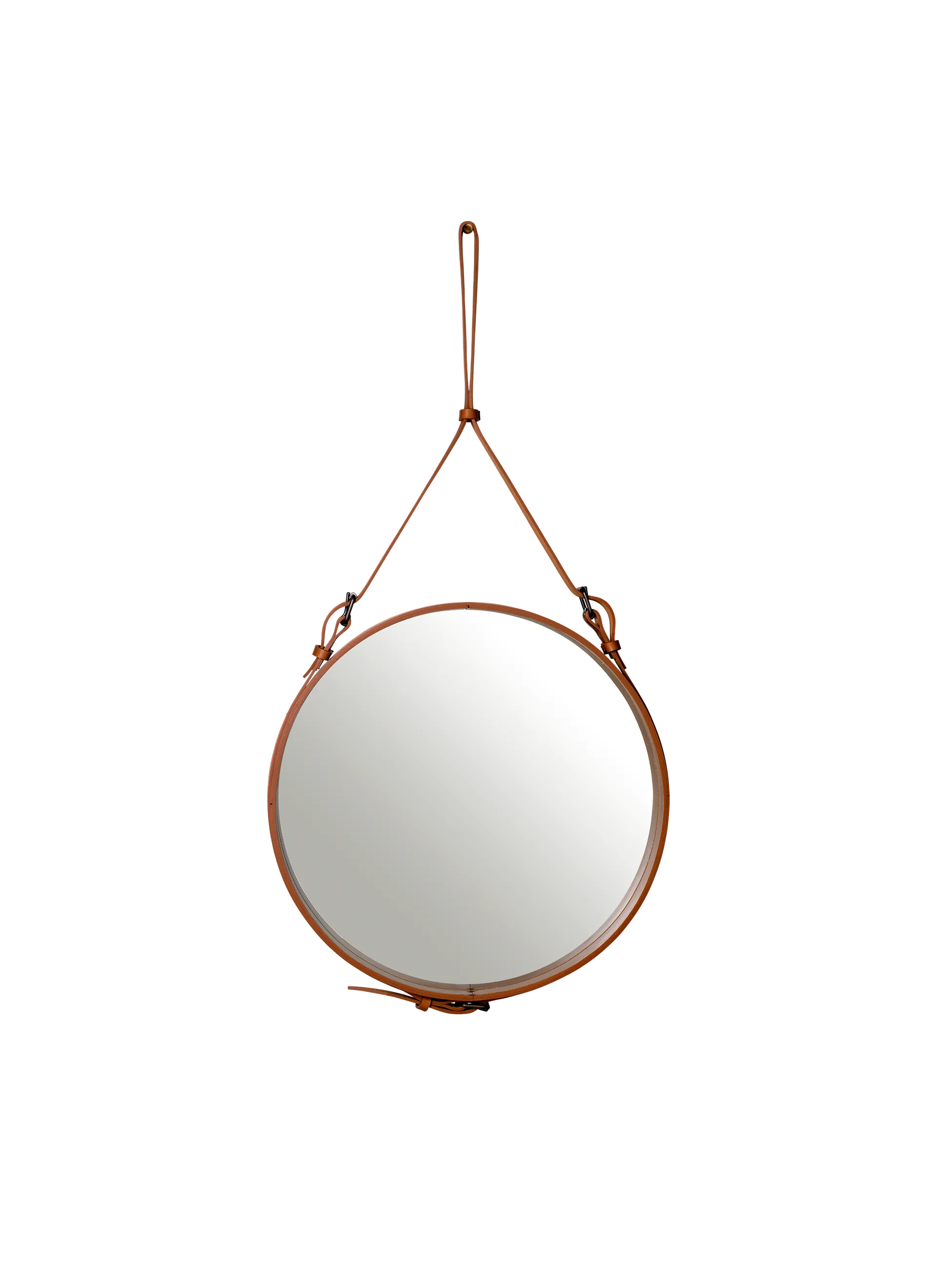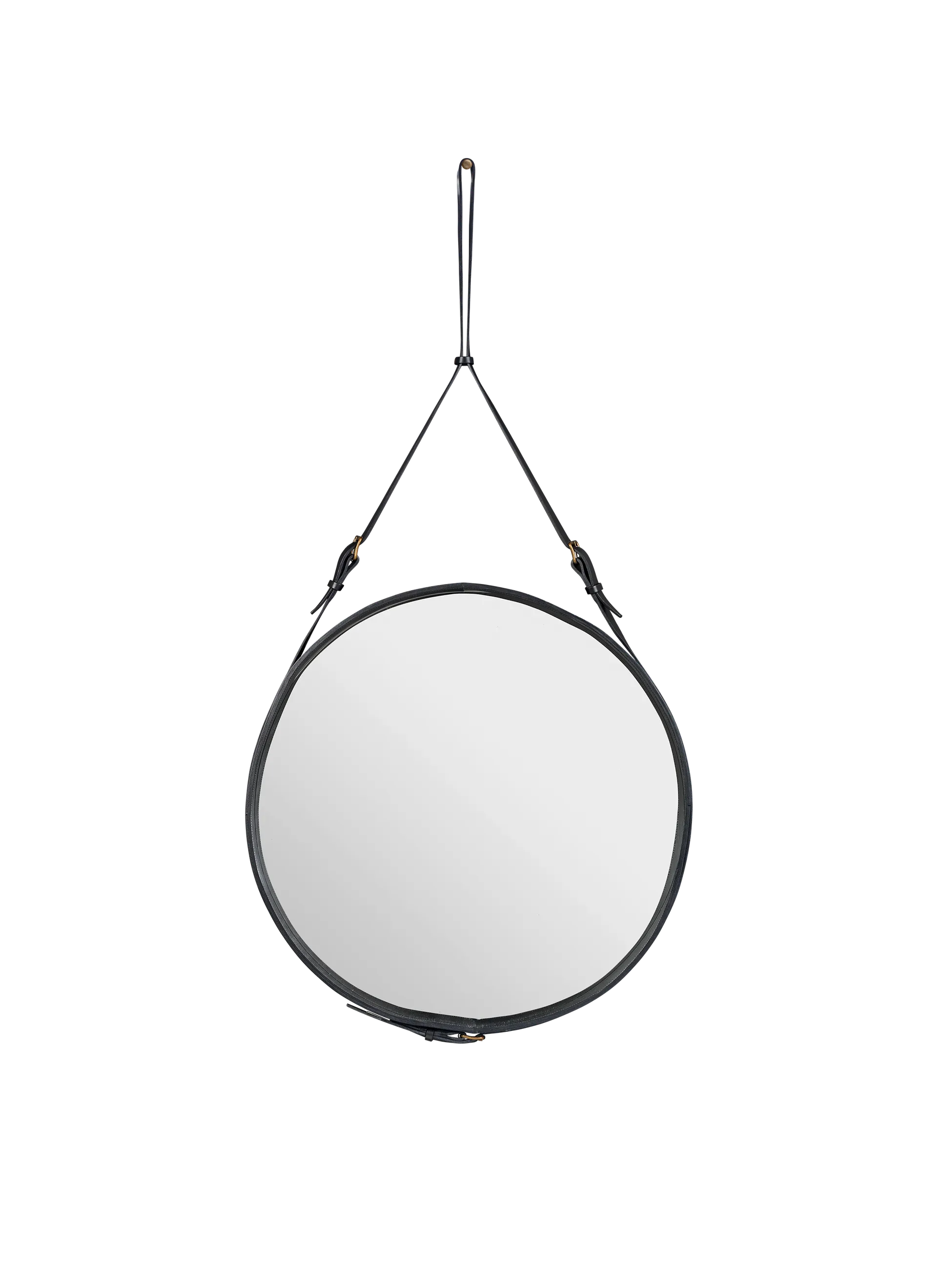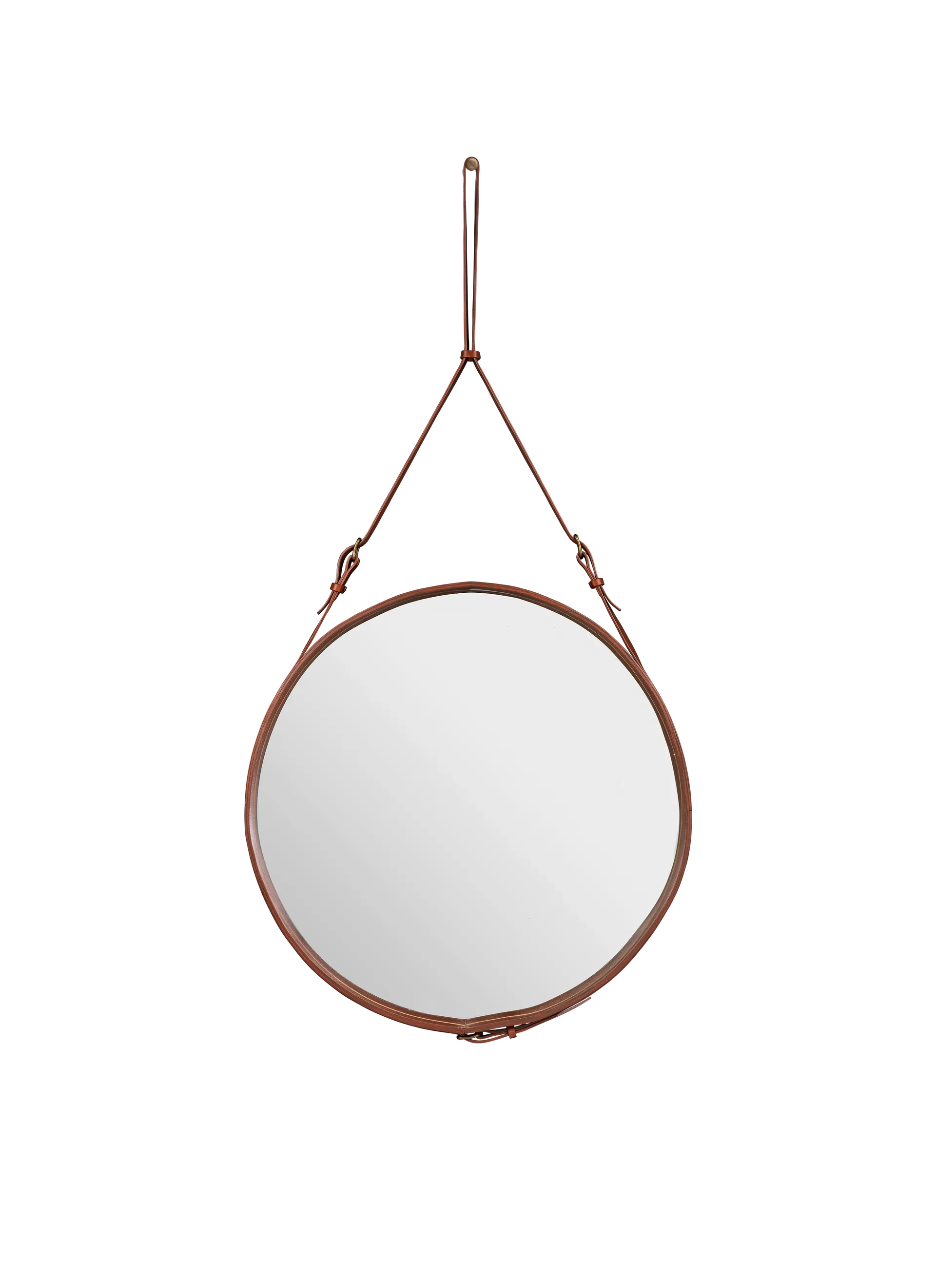 In 1950, Jacques Adnet formed a partnership with a famous French fashion house, where he developed a collection of discreet yet voluptuous leather-covered furniture and interior accessories. Known for being an innovative thinker, Adnet was one of the first designers to combine leather with glass. Accordingly, he designed the elegant, distinctive round leather mirror with equestrian inspired detailing - the Adnet Wall Mirror Circular. Besides the remarkable leather and burnished brass details, the mirror in three sizes is also unique as the strap holding the mirror is in direct proportion to the dimension of it.
