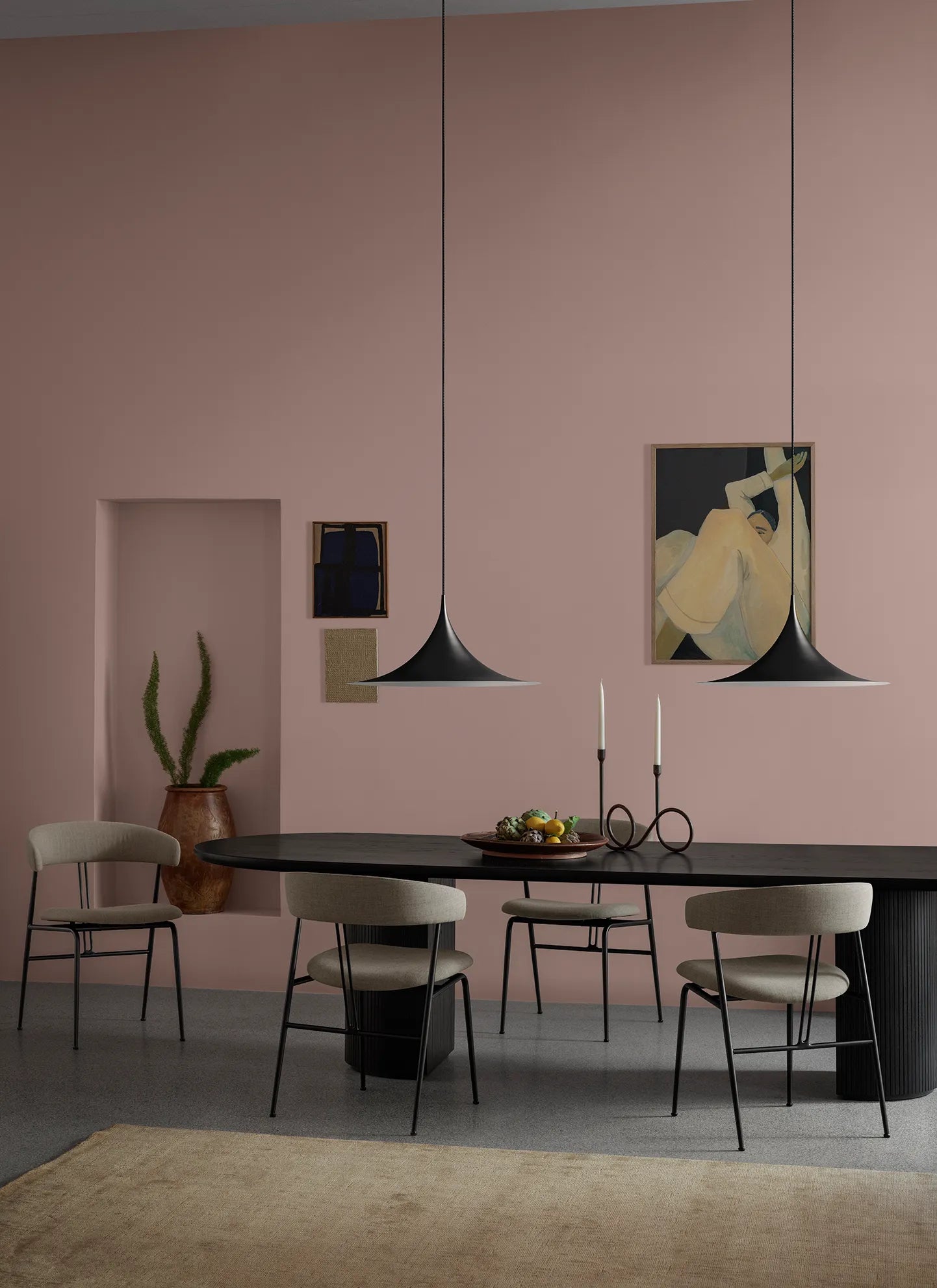 Space Copenhagen is the designer behind the classic Moon Dining Table; a series of organic rounded tables for both domestic and public spaces. The interplay between the beautiful veneer oak table top and the smooth half – or full moon shaped base, with bevelled surface, serving as structure and ornament, creates a simple yet strong identity for the design.
