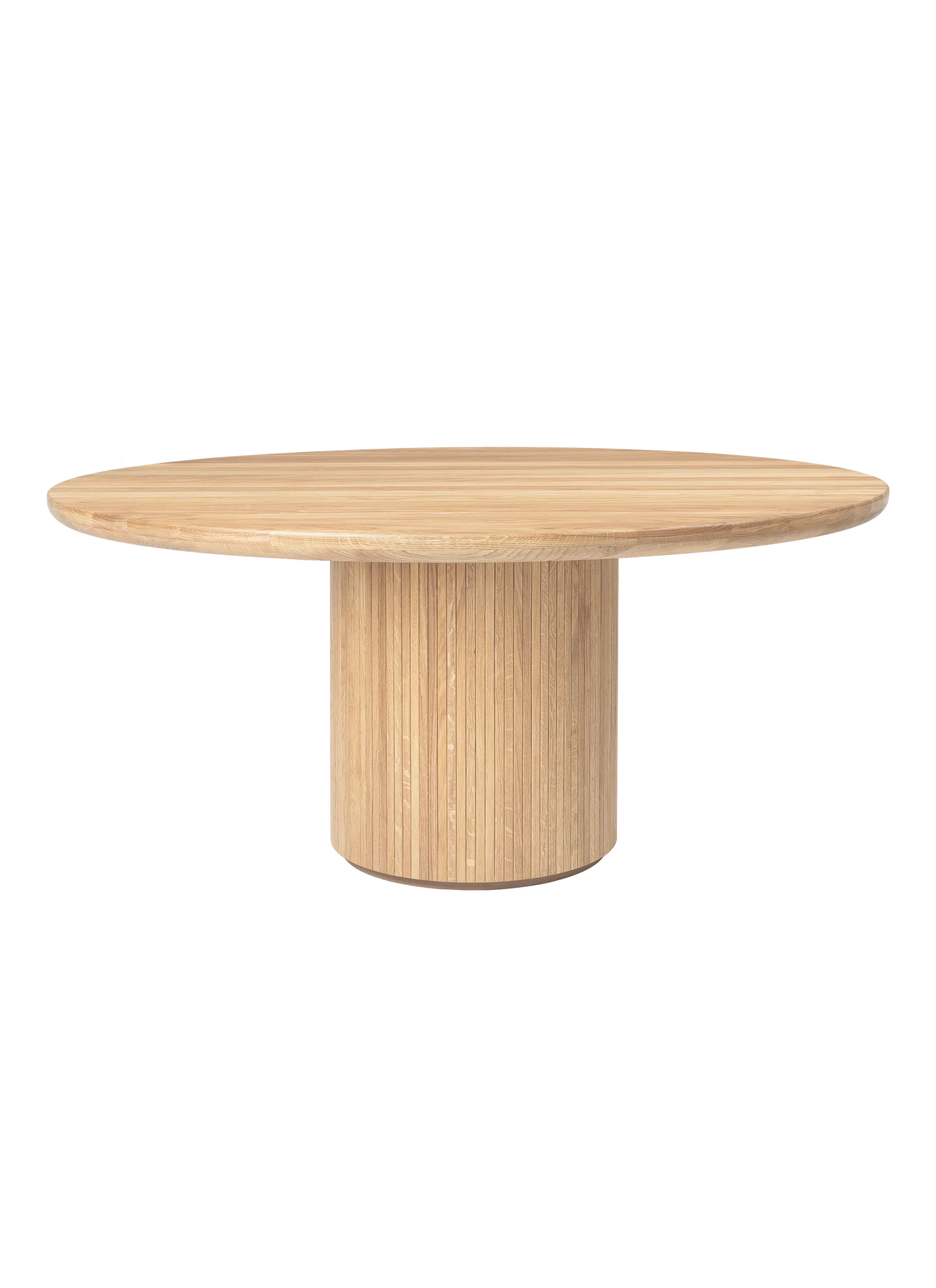 The interplay between the beautiful solid oak table top and the smooth half – or full moon shaped base, with bevelled surface, serving as structure and ornament, creates a simple yet strong identity for the design.