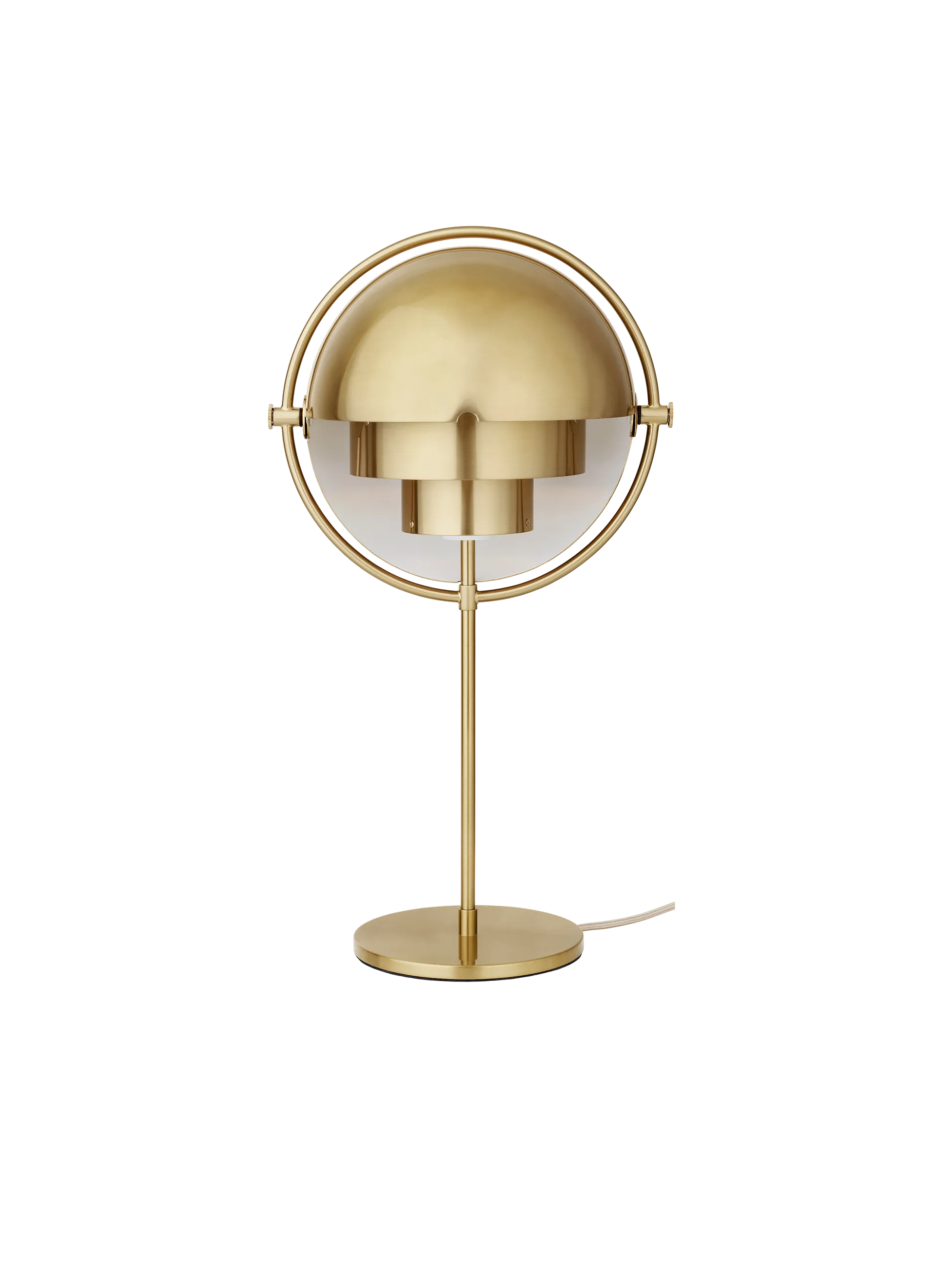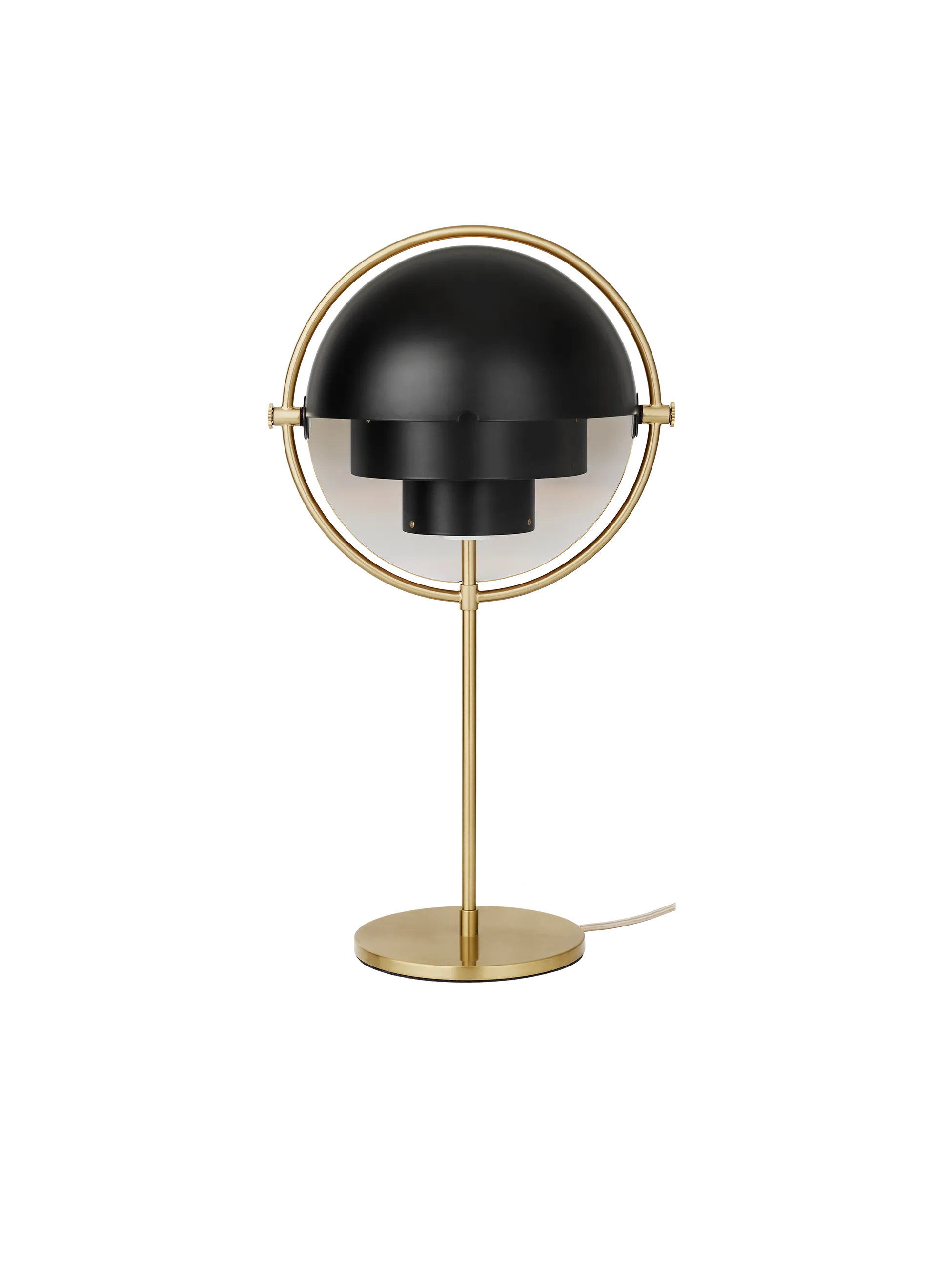 The Multi-Lite was first designed in 1972 by Louis Weisdorf with the aim of celebrating his passion for diversity. Two cylindrical shapes lay the foundation of the lamp and a metal ring encompasses it and anchors the two-quarter spherical shades, which ultimately completes a picture of an iconic design with multiple purposes. The decorative Multi-Lite Table Lamp is an evolution of the pendant design and ideal for creating a festive ambient light in domestic environments as well as hotel rooms and other public areas.