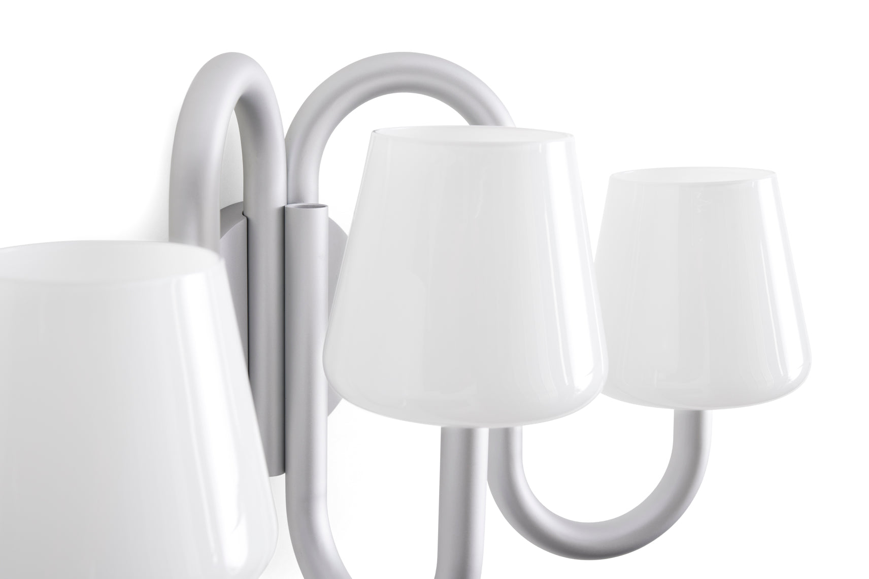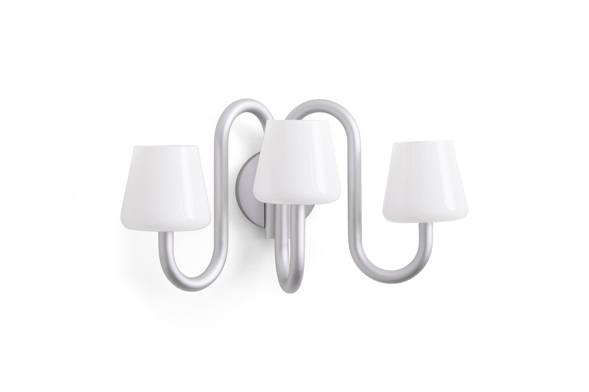 Designed by STUDIO 0405, the Apollo Wall Sconce is a contemporary take on a classic lamp archetype, sharing basic structural characteristics of the traditional sconce updated in a sculptural and functional design. Comprising three mouth-blown opal glass shades atop curved tubular arms, creating a contrasting expression between the handcrafted, organically shaped shades and the industrial anodised aluminium tubing. Once mounted on the wall, the Apollo Wall Sconce can be used for highlighting a specific area or adding atmosphere to a variety of private and public places.