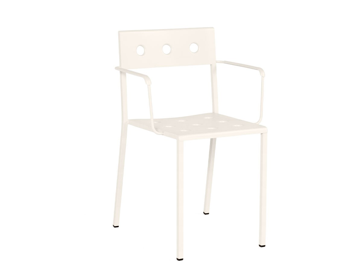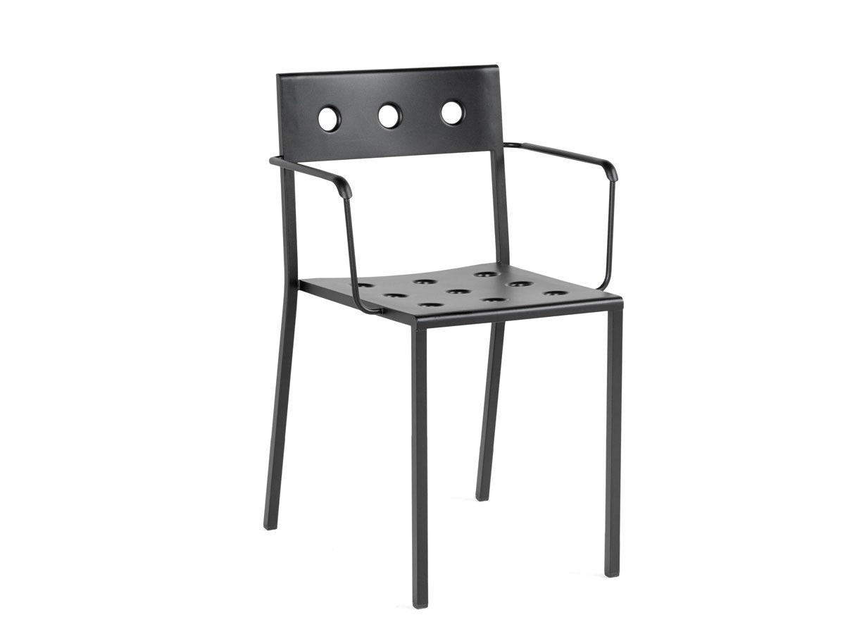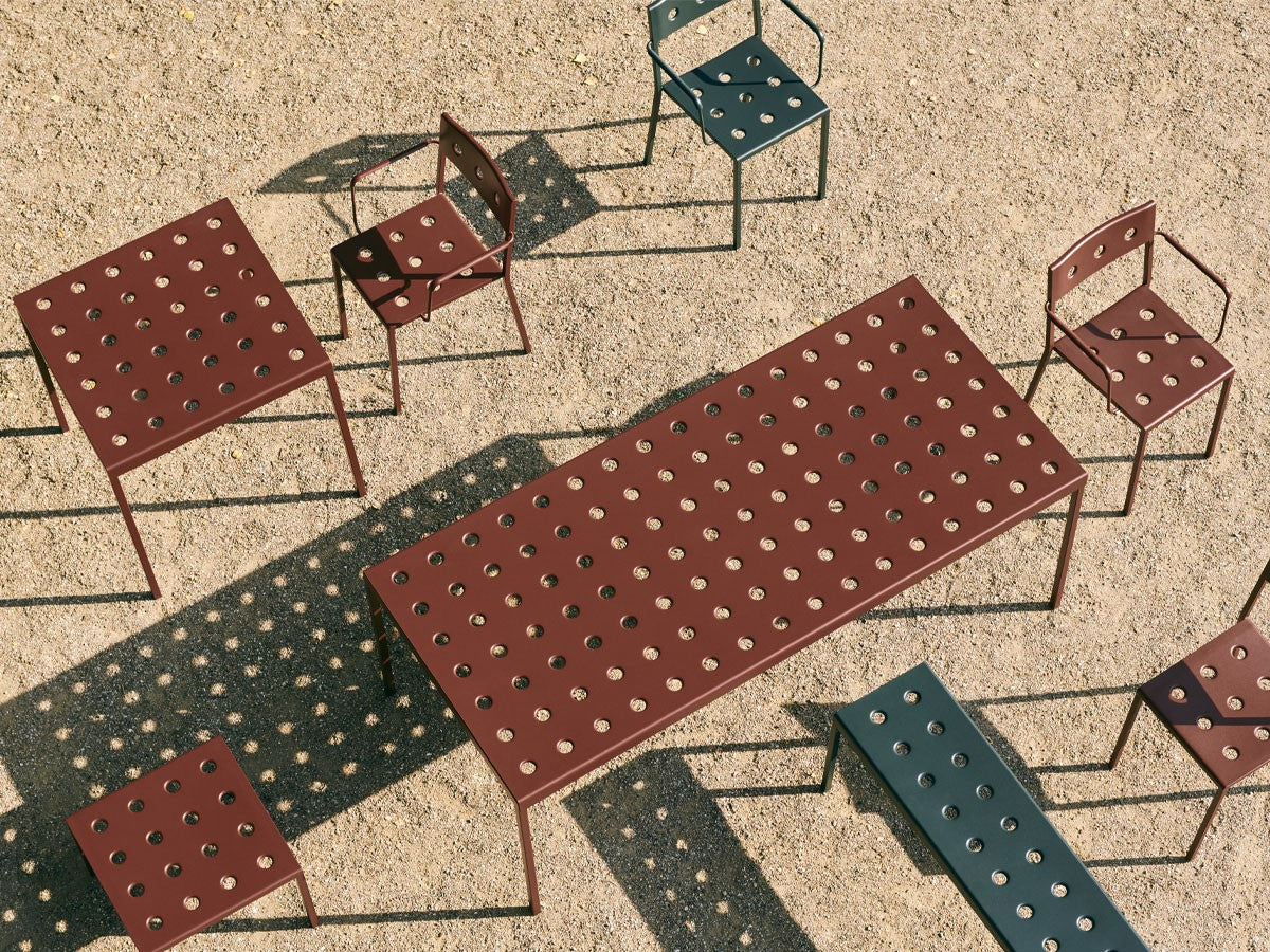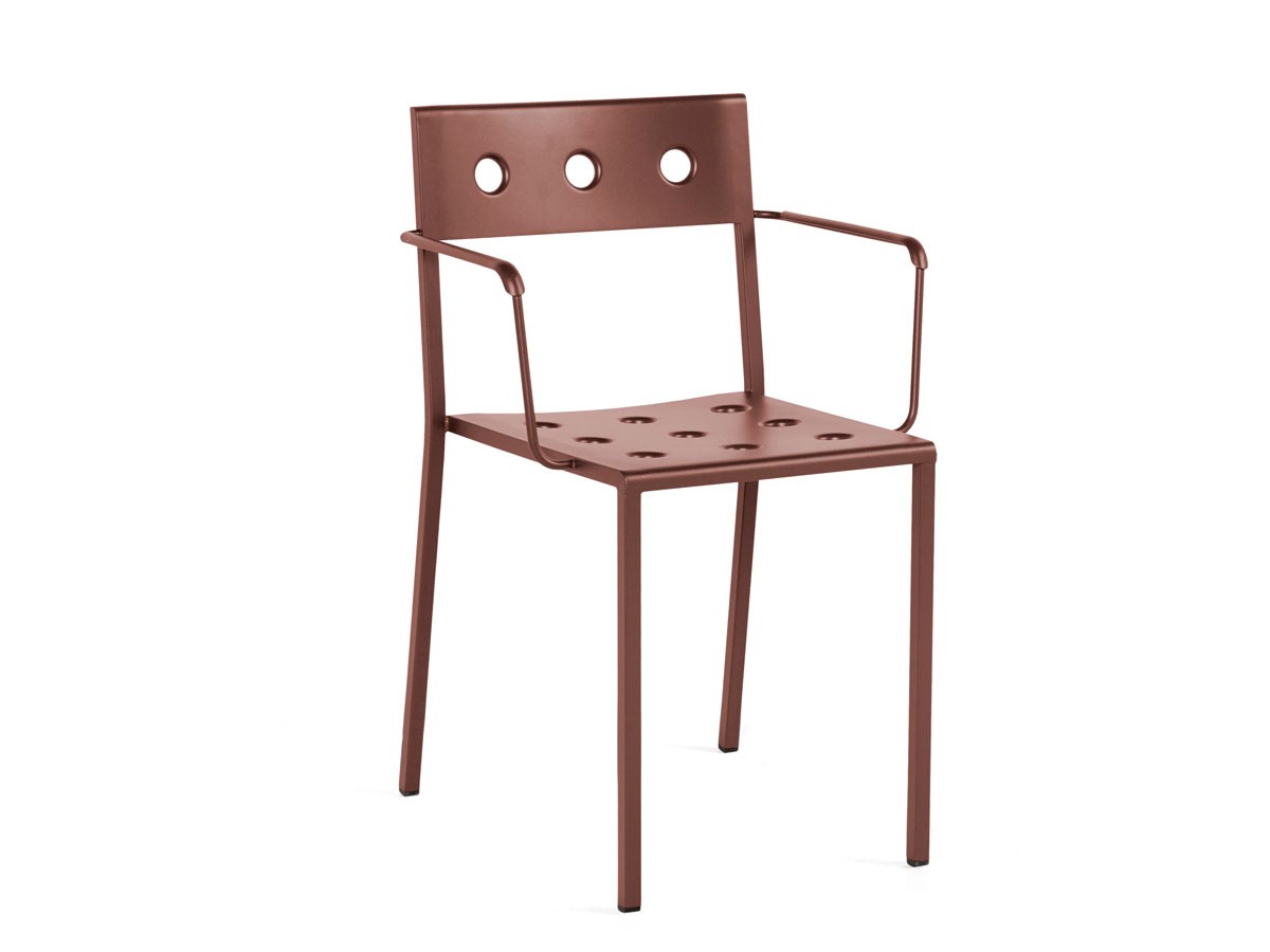 Designed for HAY by Ronan and Erwan Bouroullec, the Balcony Armchair is an elegant and functional dining chair with armrests for outdoor use. The square design is softened by the rounded back and slender armrests, with the multiple holes in the seat and back strengthening the construction, as well as creating a distinct expression.