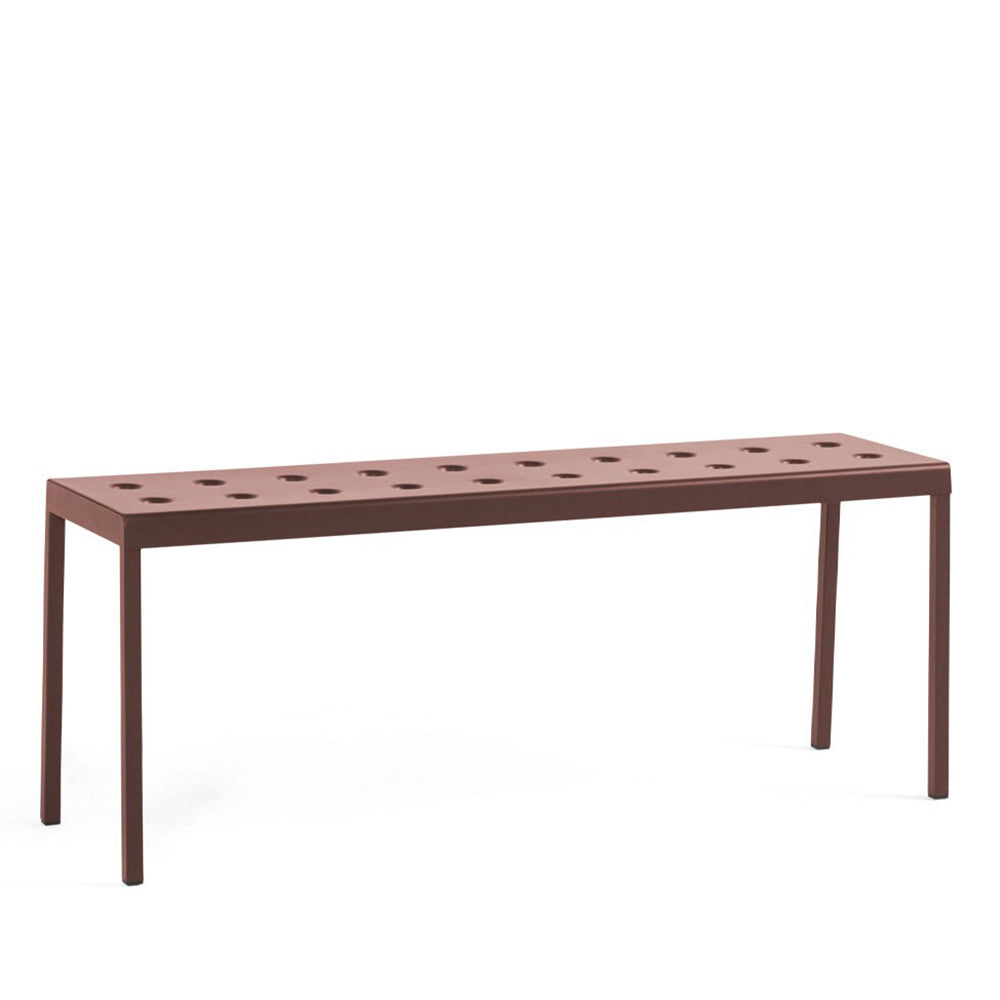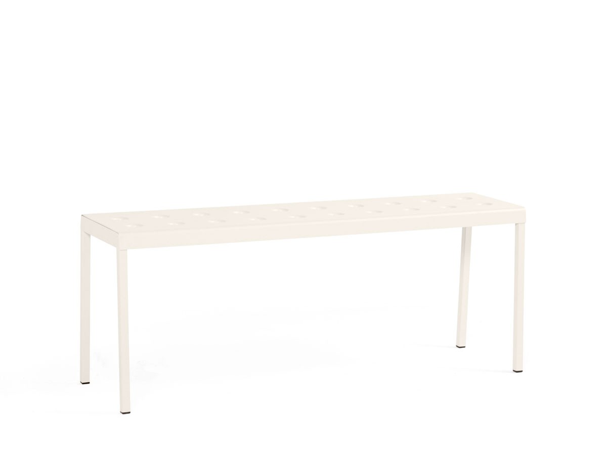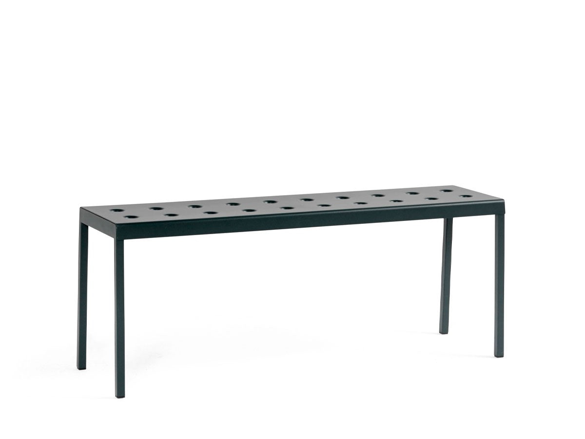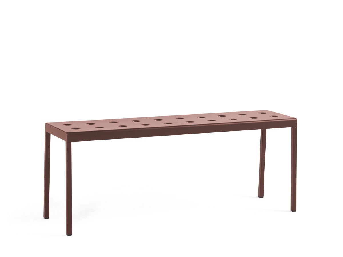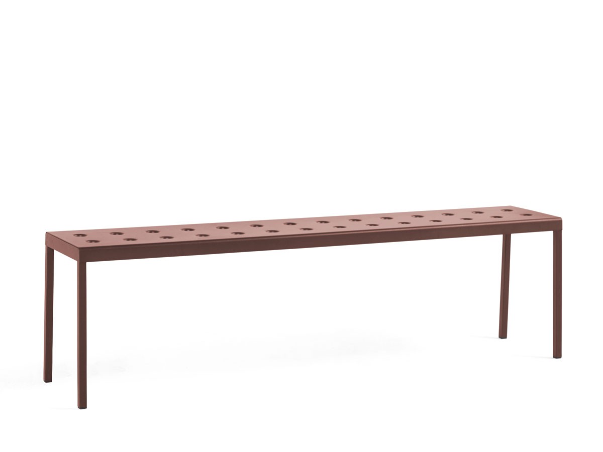Designed for HAY by Ronan and Erwan Bouroullec, the Balcony Bench is an elegant seating solution for outdoor use. The simple rectangular design is softened by the slender legs, with the multiple holes in the seat strengthening the construction, as well as creating a distinct expression.
