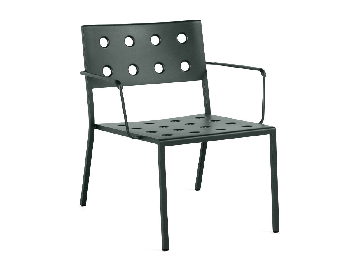 Designed for HAY by Ronan and Erwan Bouroullec, the Balcony Lounge Armchair is a low and comfortable lounge chair with armrests for outdoor use. The wide, square design is softened by the rounded back and slender armrests, with the multiple holes in the seat and back strengthening the construction, as well as creating a distinct expression.