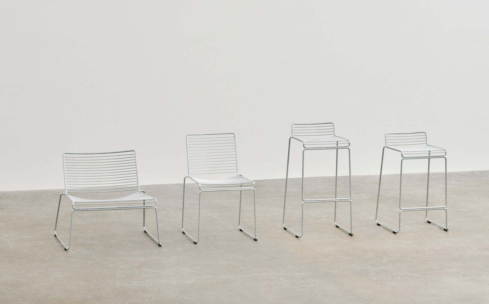 The philosophy behind the Hee Series was to take an archetypal chair and perfect it to the last detail, with the goal of creating a contemporary chair that could fit into a wide range of contexts. Like a line drawing, Hee wraps metres of metal wire into neat, straight lines in three versions: bar stool, lounge chair, and dining chair. Stackable and weatherproof, the chairs’ functional design combined with its choice of powder coated colours and hot galvanised steel variants make the series suitable for numerous indoor and outdoor contexts in both public spaces and home environments.