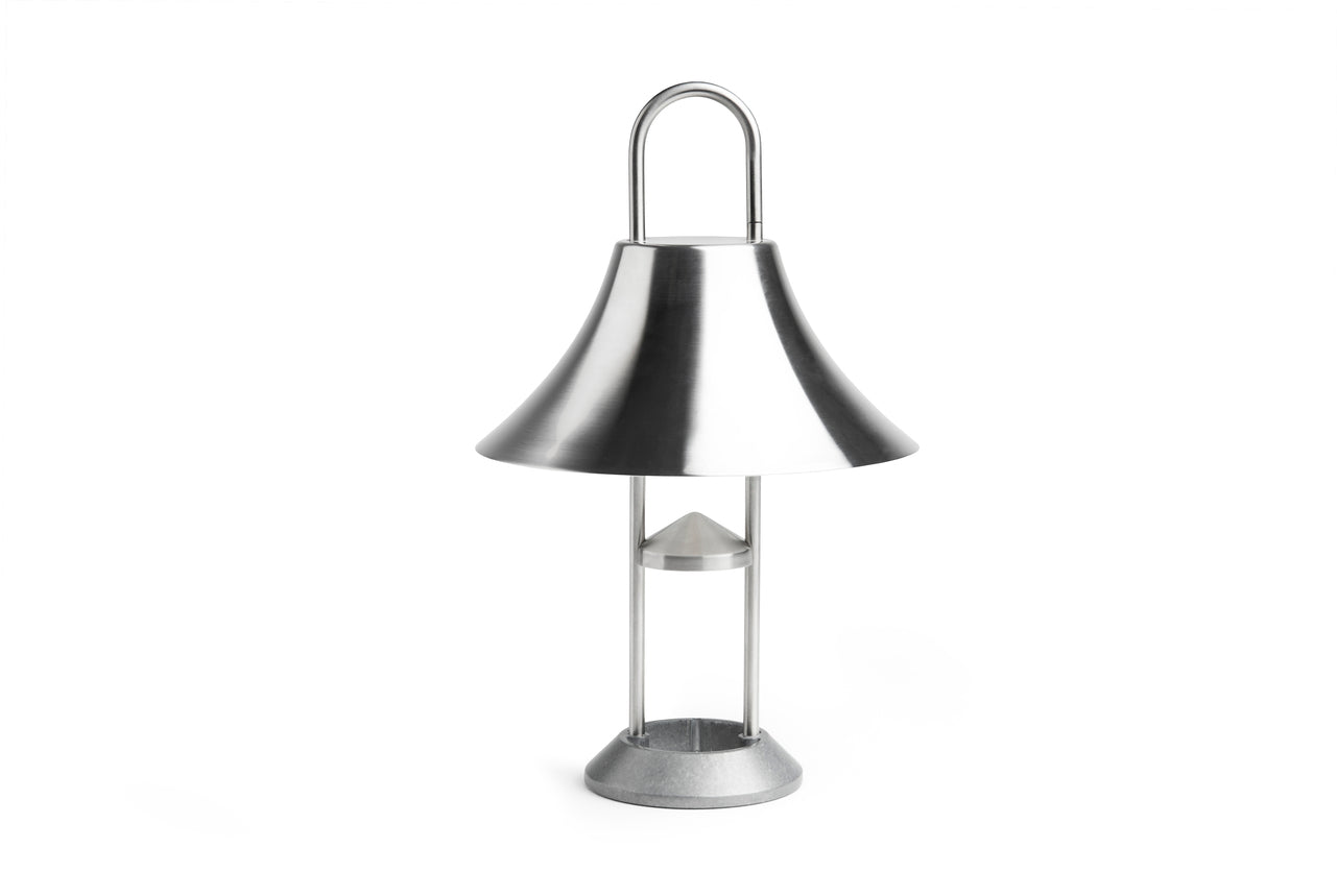 Featuring a rechargeable battery for easy and spontaneous placement, the lamp’s weather-proof body is made from stainless steel and a zinc alloy with a choice of coloured shades, making it ideal for both inside and outside use.