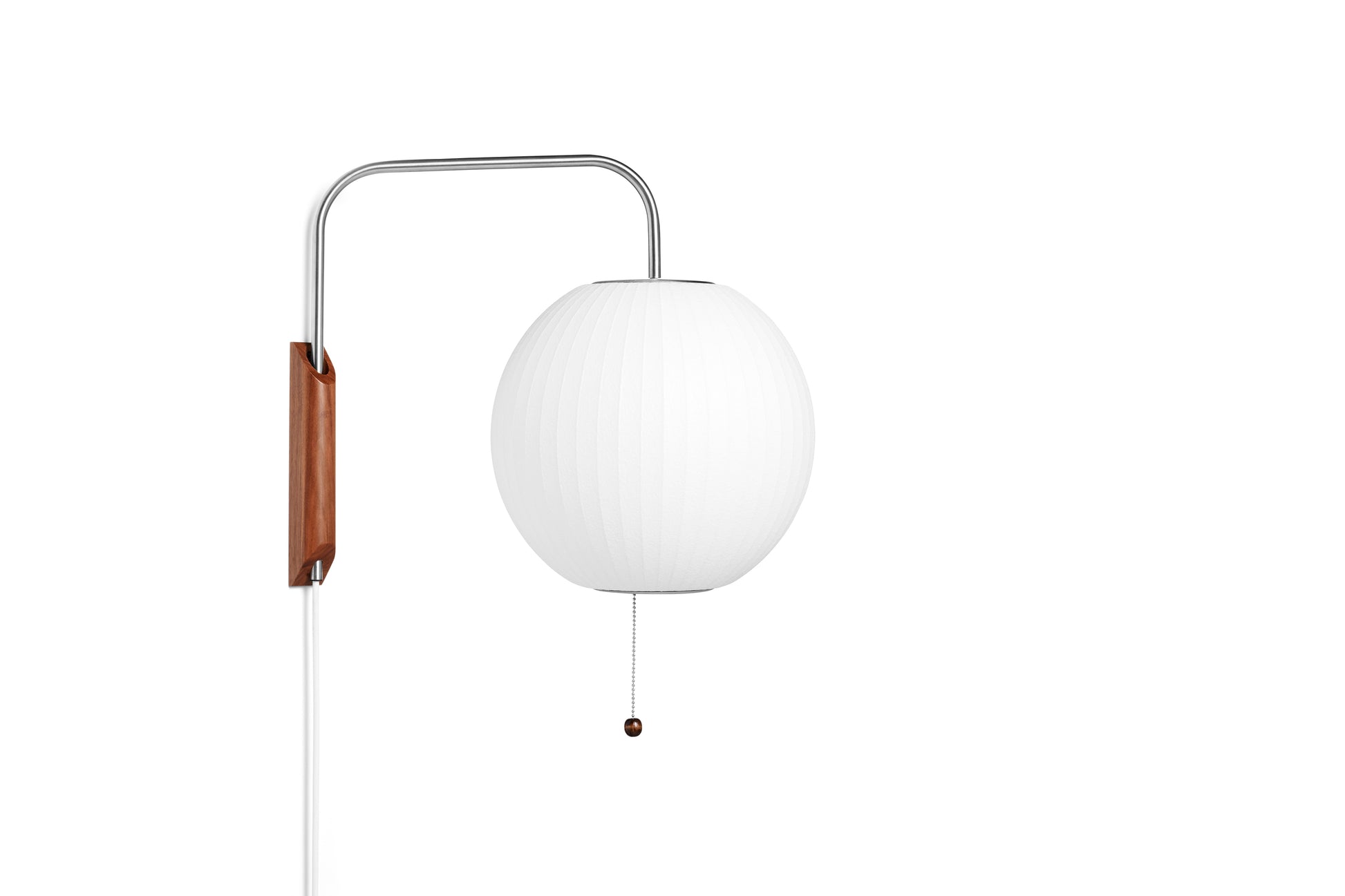 Part of the Nelson Bubble Lamp series, the Nelson Wall Lamp series comprises a range of wall-mounted lighting solutions. Featuring a spherical shade suspended from a walnut wall mount and steel arm, the lamp fills any interior with a warm, diffused light. The lamp’s arm can be adjusted from left to right and up and down without having to change its position on the wall. Available in Ball, Pear, Cigar, and Saucer variants.