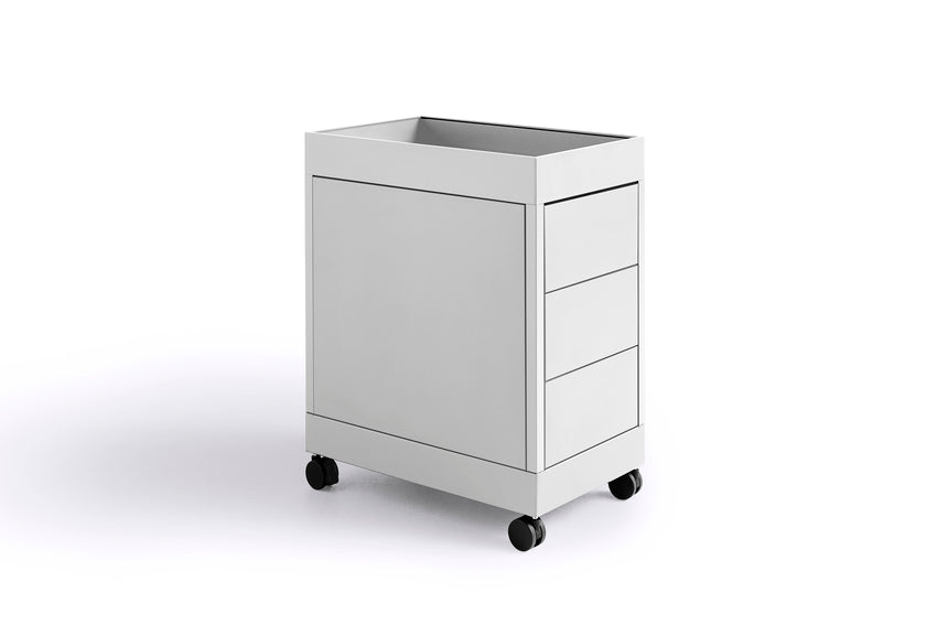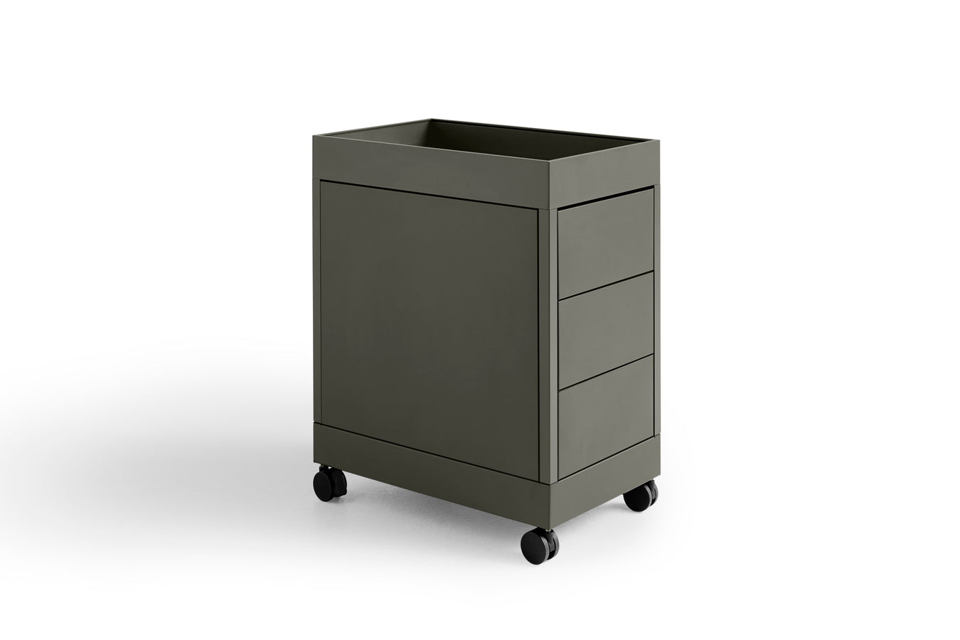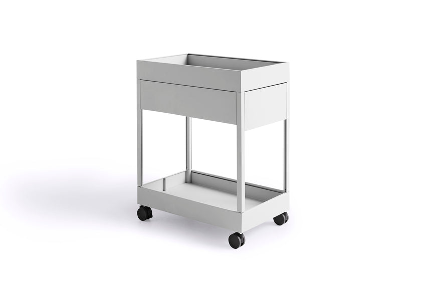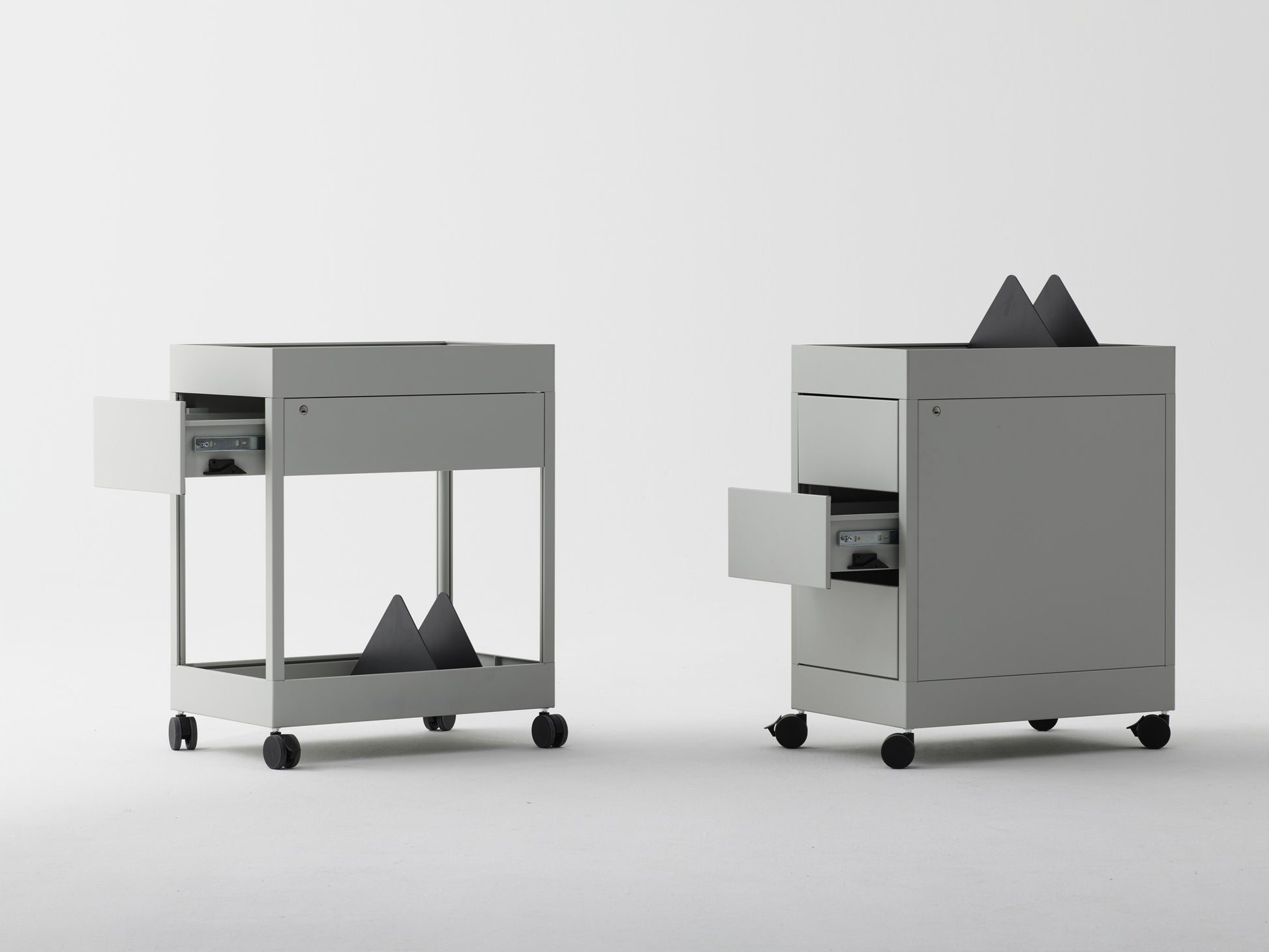 New Order’s mobile trolleys feature a tray top and come with a single drawer and open shelf below, as well as a closed unit with three drawers.