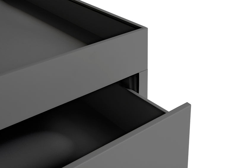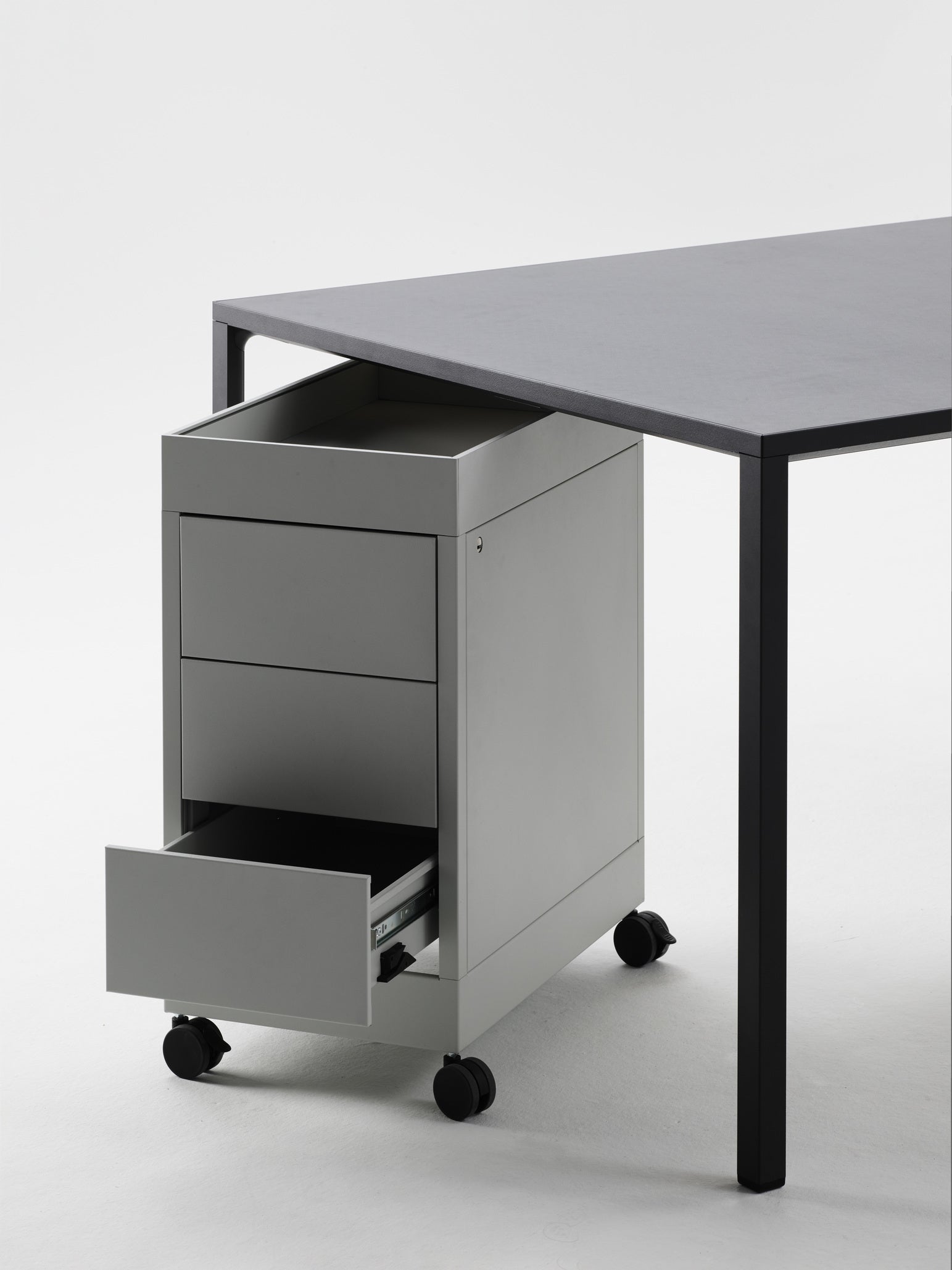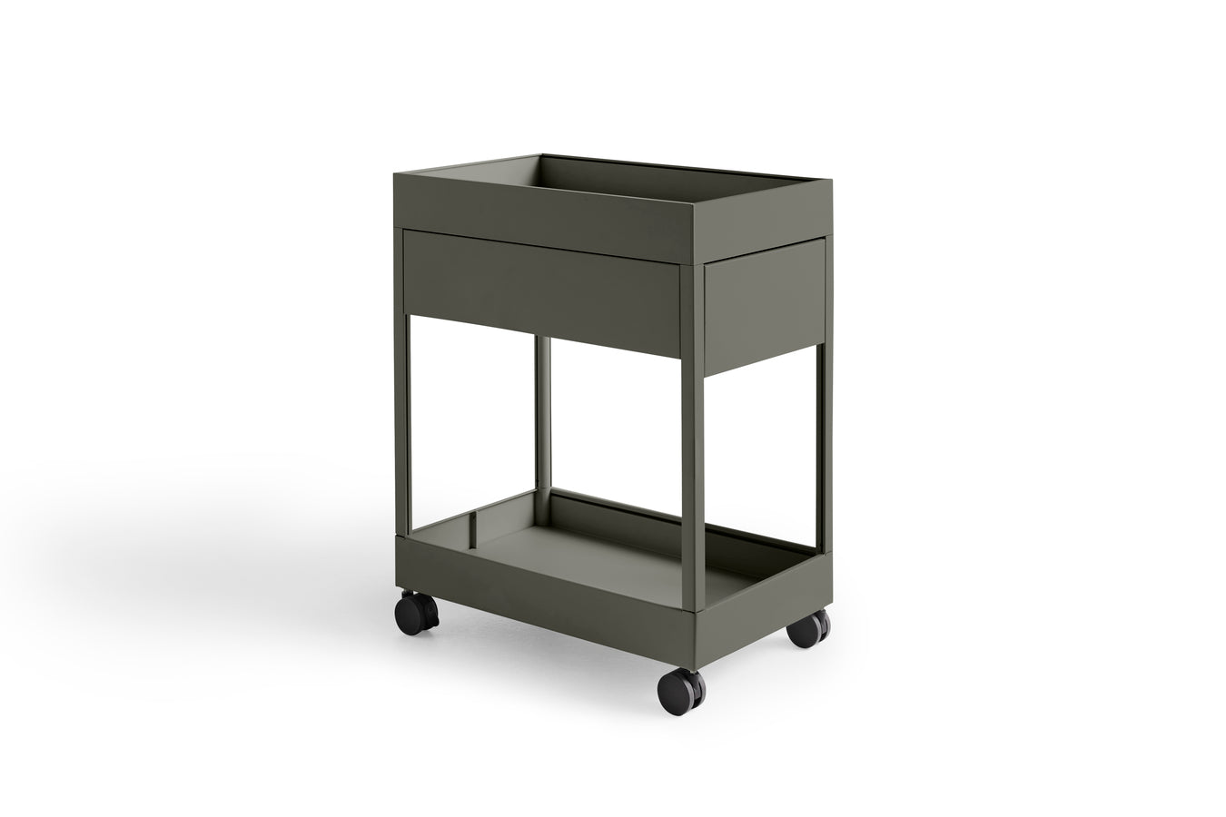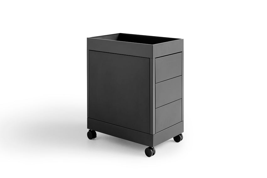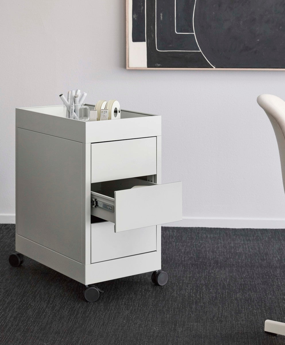 New Order’s mobile trolleys feature a tray top and come with a single drawer and open shelf below, as well as a closed unit with three drawers.