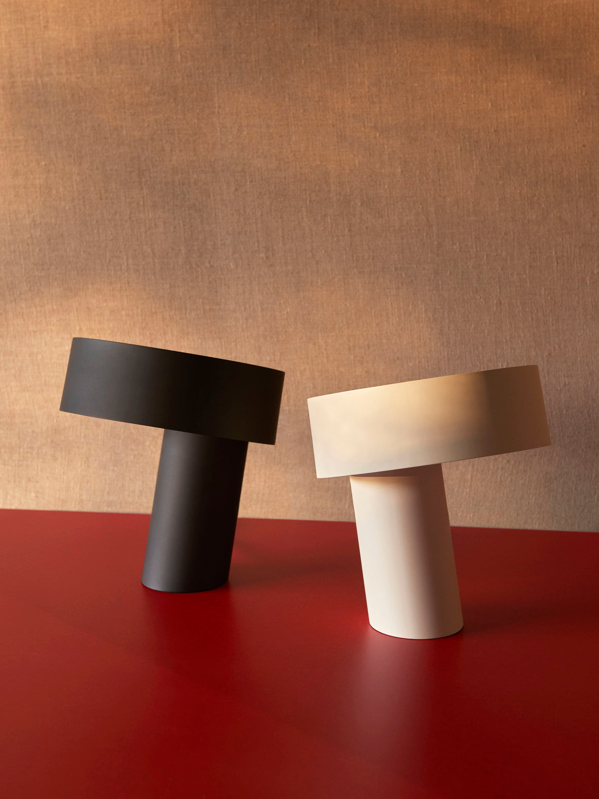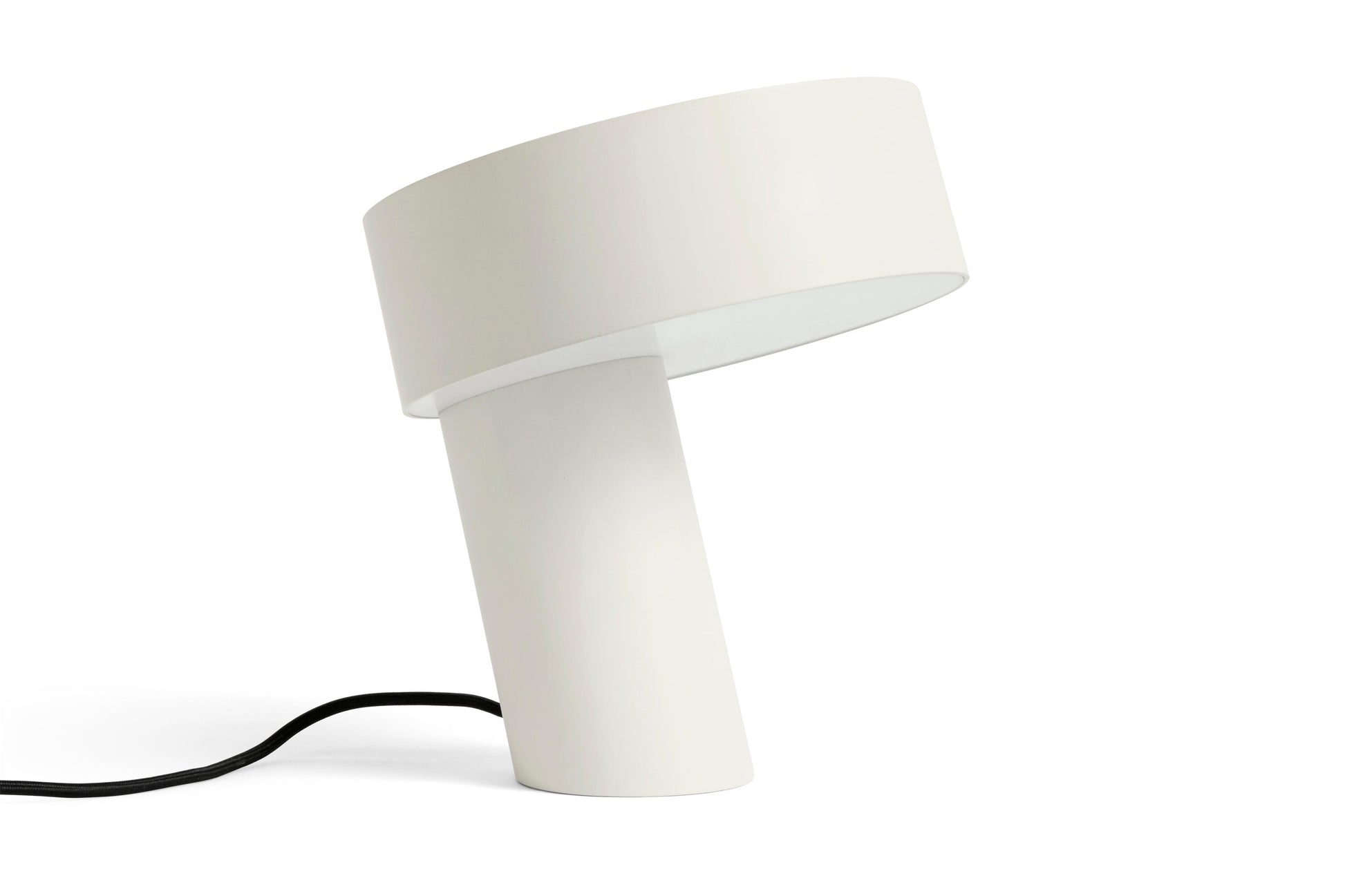 Sculptural and graphic lamp comprising a simple, slanted cylindrical form with a weighted base to keep the angle perfectly balanced.