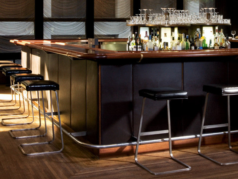 The Four Seasons restaurant was designed by Phillip Johnson and is housed in the Seagram building in New York City, designed by Mies van der Rohe. The KnollStudio logo and the signature of Mies van der Rohe are stamped into the base of the stool.