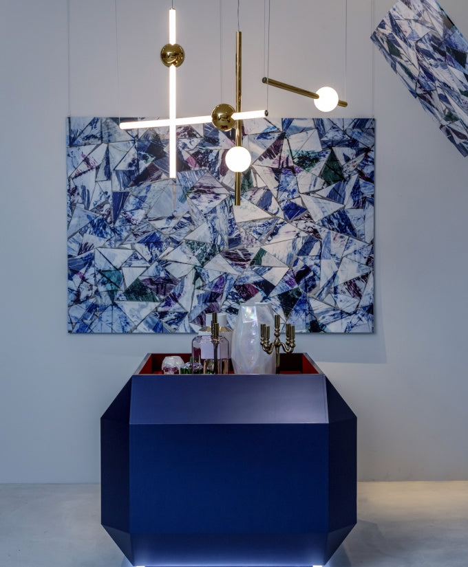 Orion comprises simple modular lights with opposing opaque and solid polished gold spheres along with opaque and solid polished gold tubes. These connect and expand horizontally and vertically to create bespoke constellations of light with infinite adaptations.