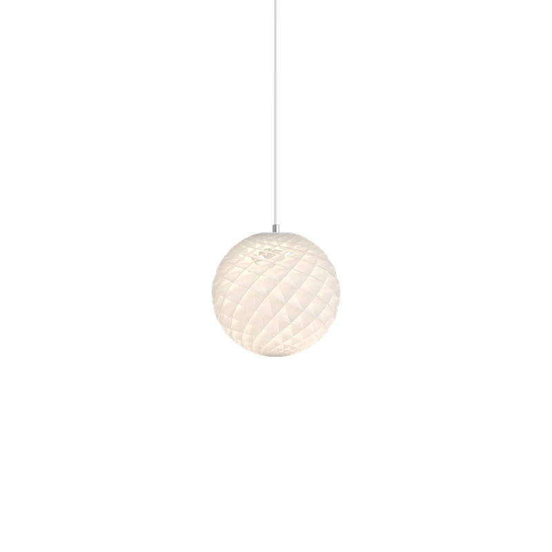 The pendant is a glowing sphere built up of small diamond-shaped cells. Each cell is carefully designed to capture light and to shield the light source from the viewing angles above 45 degrees. Each cell glows. Below 45 degrees, the fields are open to direct light downwards. A small amount of light is also sent upwards to illuminate the ceiling.