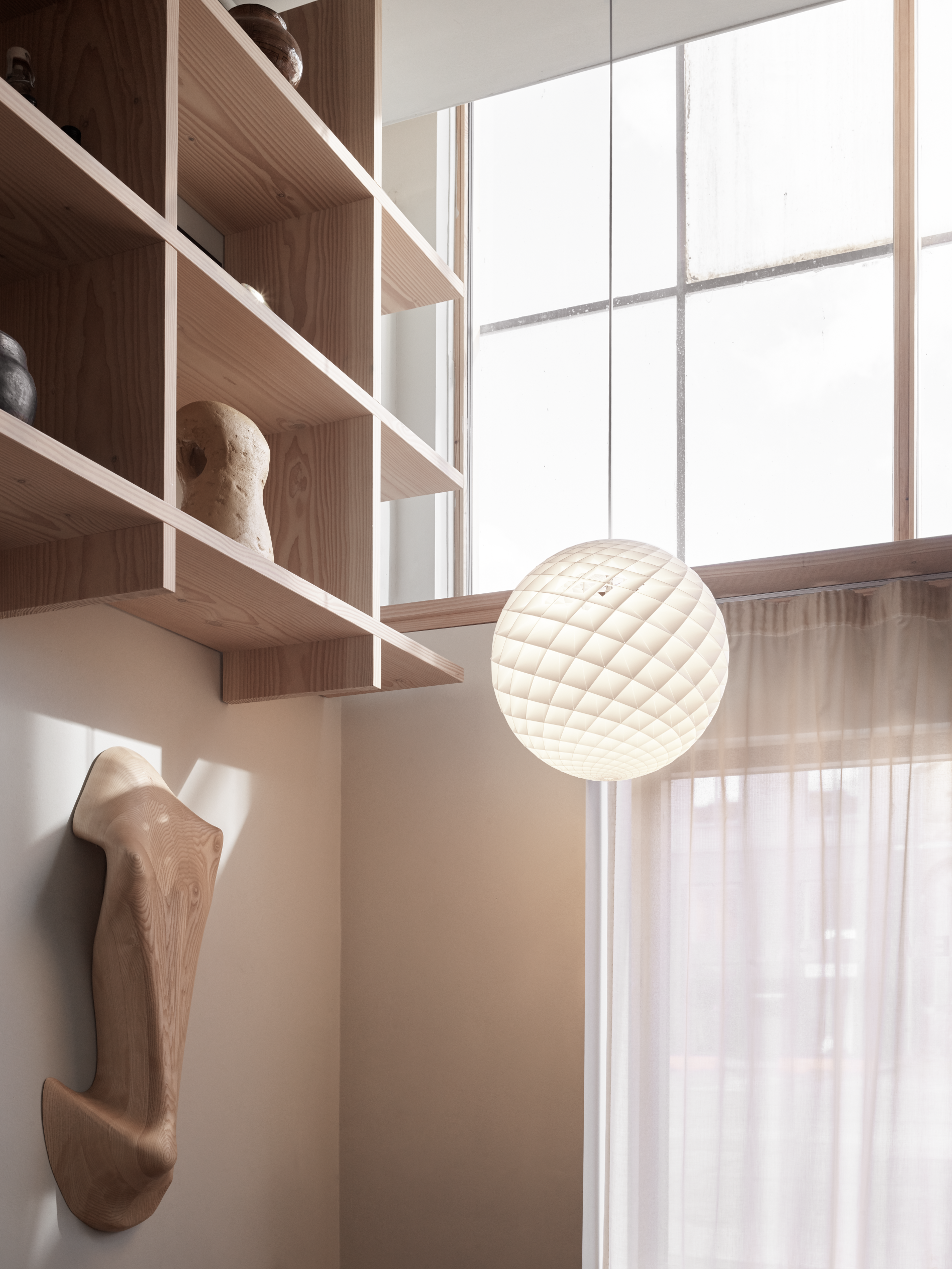The Louis Poulsen Patera Pendant Light Ø450 offers glare-free, 360-degree illumination through its intricately designed cells, providing natural and even light. Inspired by the Fibonacci sequence, its sculptural form reveals new perspectives from every angle. This modern chandelier blends mathematical precision with artistic elegance, making it a striking centerpiece for contemporary or classic interiors.