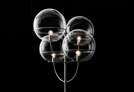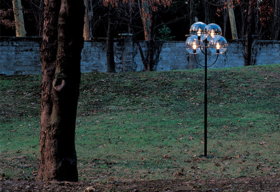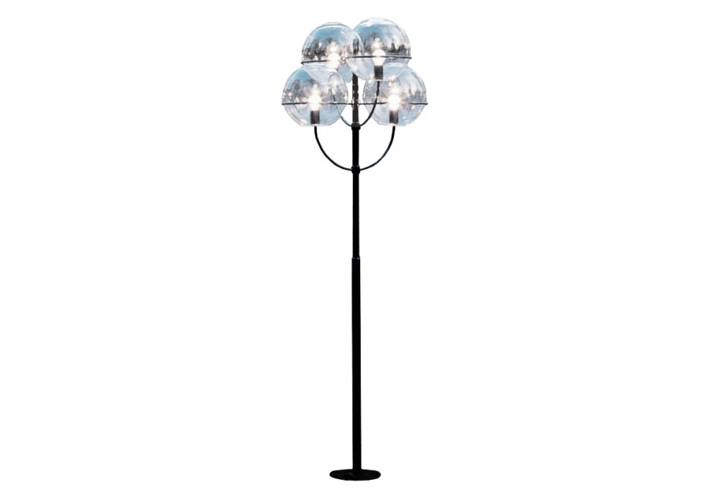 First designed in 1977, the Lyndon outdoor floor light is inspired by nineteenth-century European street lights. The transparent polycarbonate globe and zinc plated, the black lacquered stem is reminiscent of gas lighting, yet is wholly modern in its simplicity.