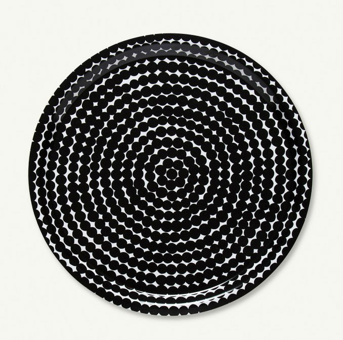 Made of laminated birch plywood, this round lightweight tray carries the classic Räsymatto pattern designed by Maija Louekari in black and white from Marimekko.