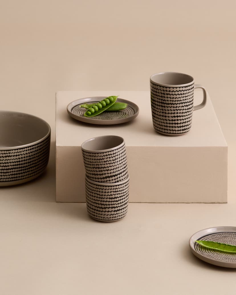 The Siirtolapuutarha pattern Oiva mug is made of brown stoneware. It is dishwasher, oven, microwave, and freezer safe.
