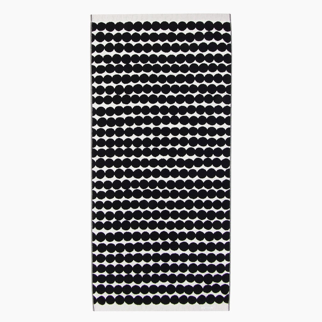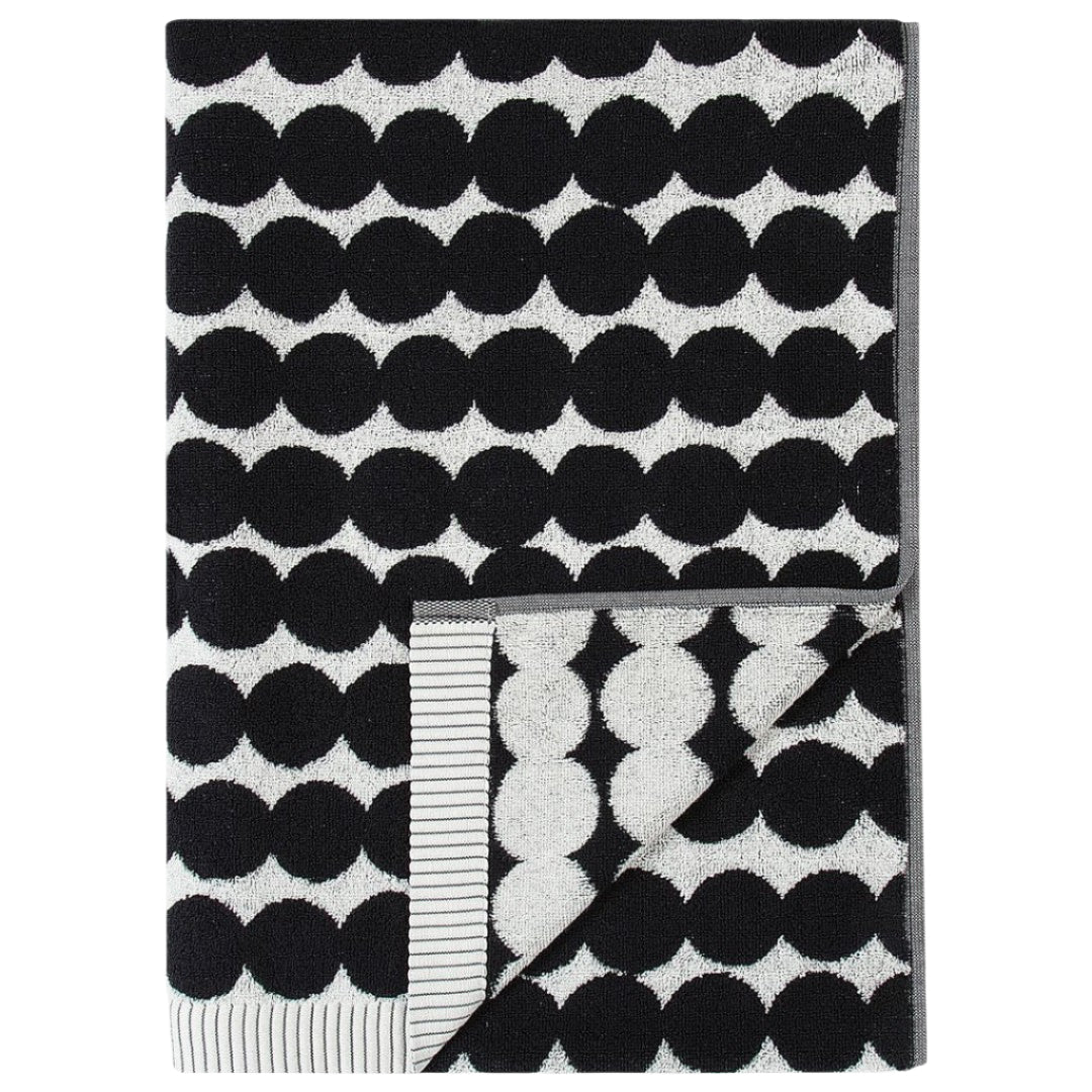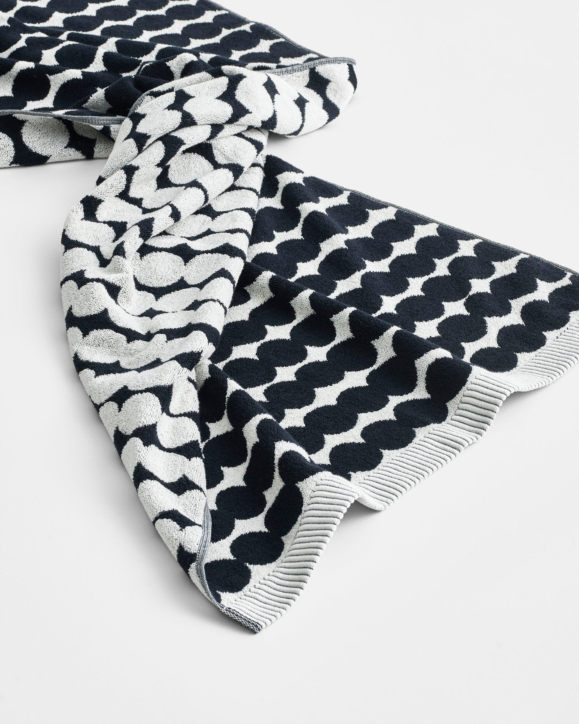 This soft, cotton bath towel is decorated with the black and white Räsymatto pattern.