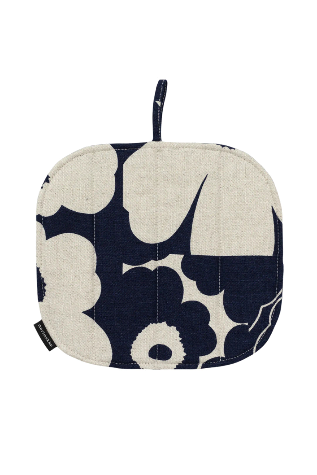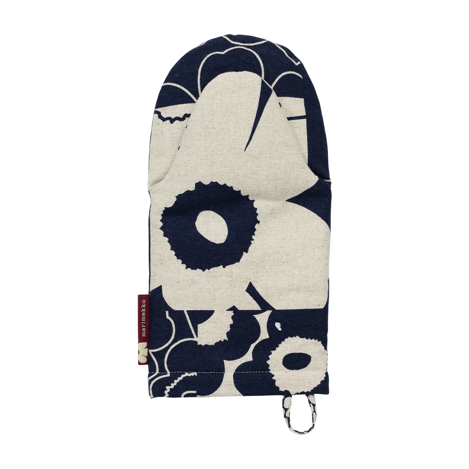 The products are made of an unbleached cotton and linen blend, which is printed in Helsinki. The oven mitten and potholder have padded fillings and hanging loops, and the kitchen towel has a hanging loop on the long edge.
