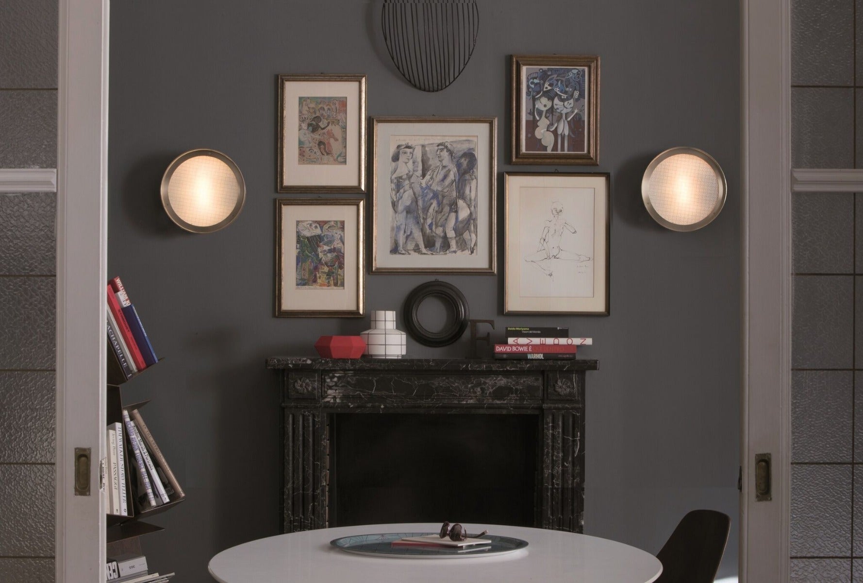 The Oluce Berlin Wall Light recalls classic art deco design through the use of brass fused with a contemporary twist of an LED light source. Made up of a thick metal ring with a slender profile enclosing a disc of wire mesh glass inside it. Lamp not included.