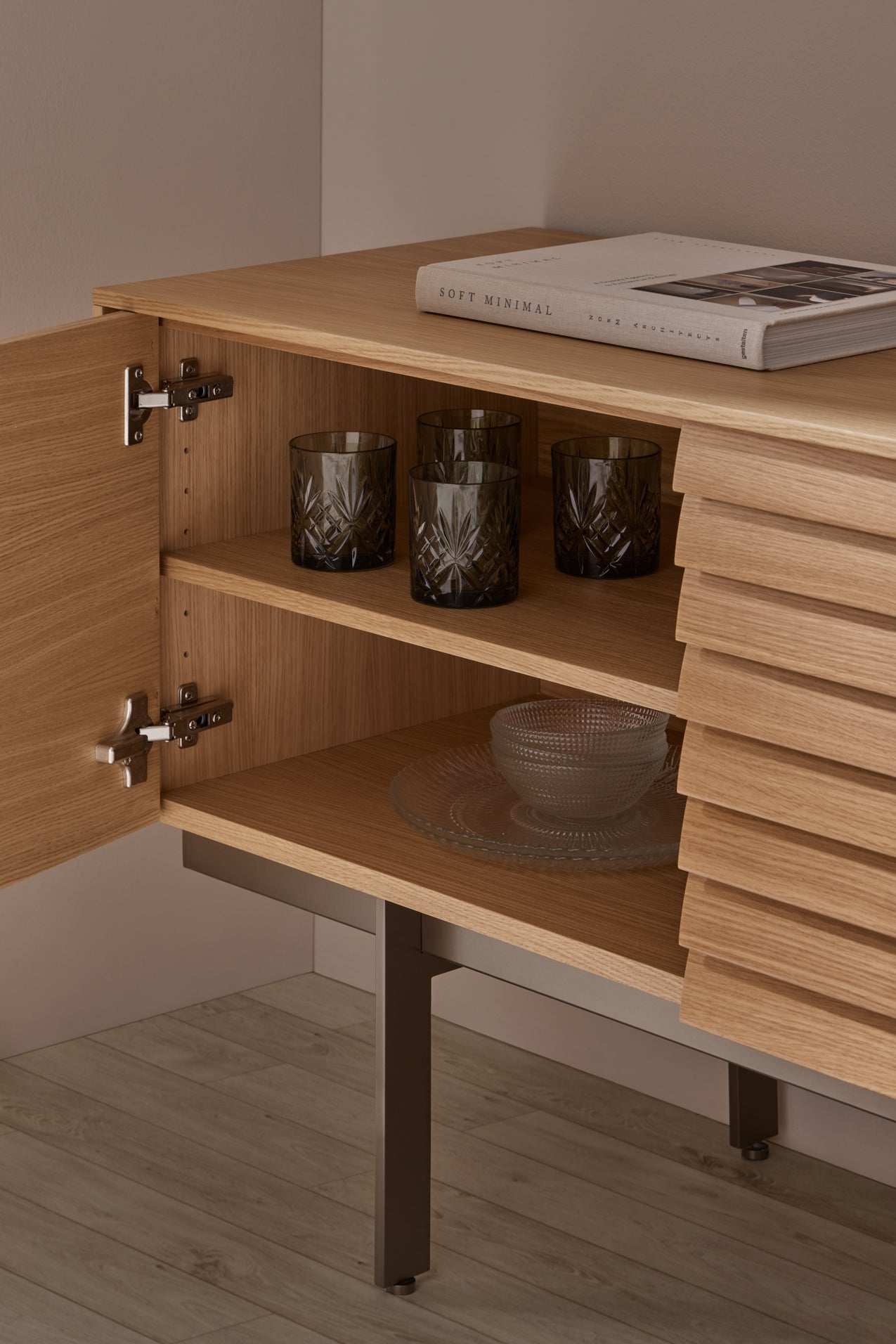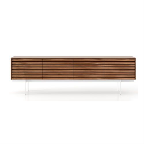 Interior and exterior of this sideboard are veneered with either natural oak or walnut (natural walnut interior with super-matt walnut and dark stained walnut exterior finishes, oak interior with all other exterior finishes). Doors have 94 degree opening and drawers have soft closure. Drawers have full extraction runners. Plinths are finished in textured powder-coated steel with adjustable feet.