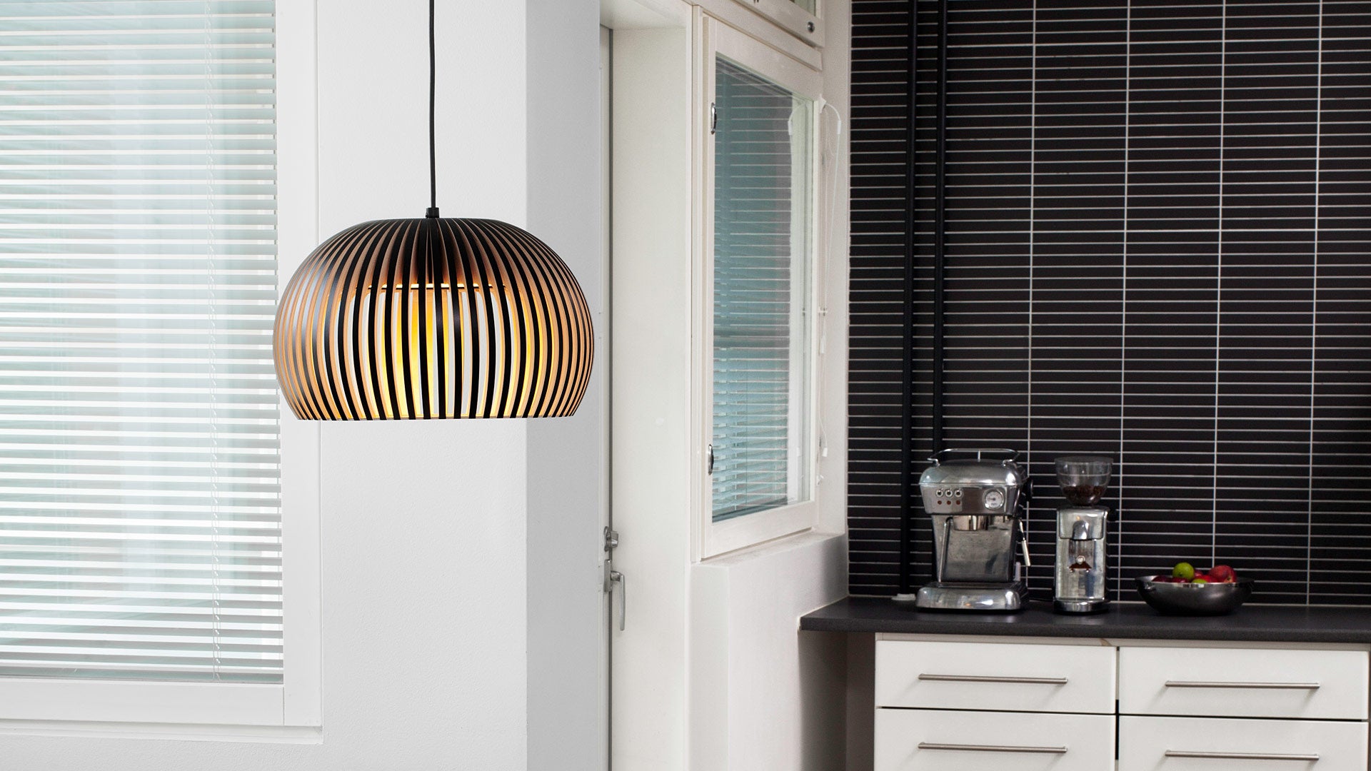 The Secto pendants, designed by interior architect Seppo Koho, has a clear and simple Scandinavian feel. The wood provides a luminosity to create atmosphere and appeal. Available in natural birch, white laminated birch, black laminated birch or in walnut veneer.