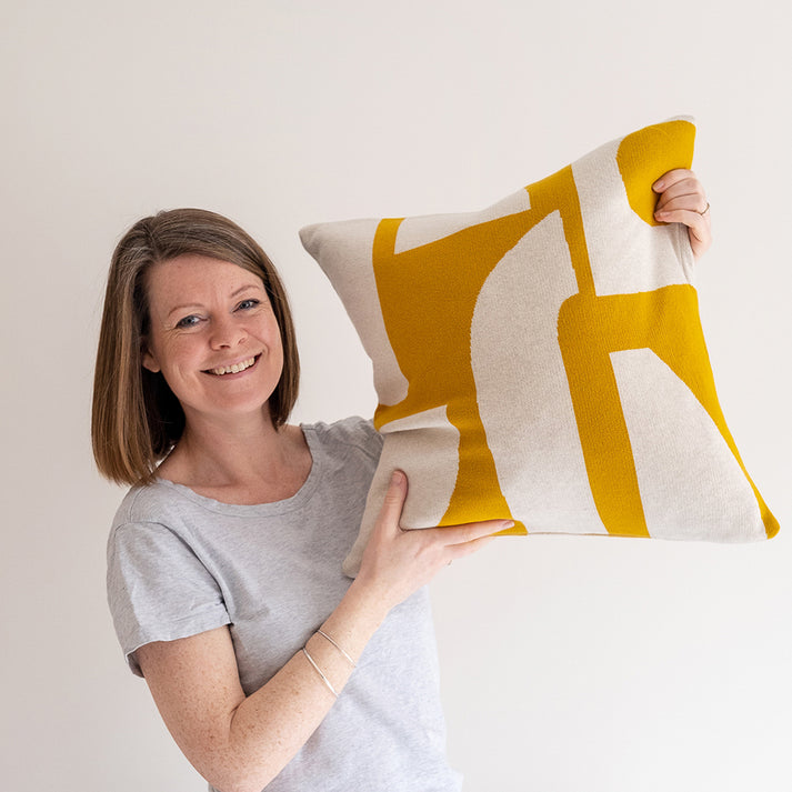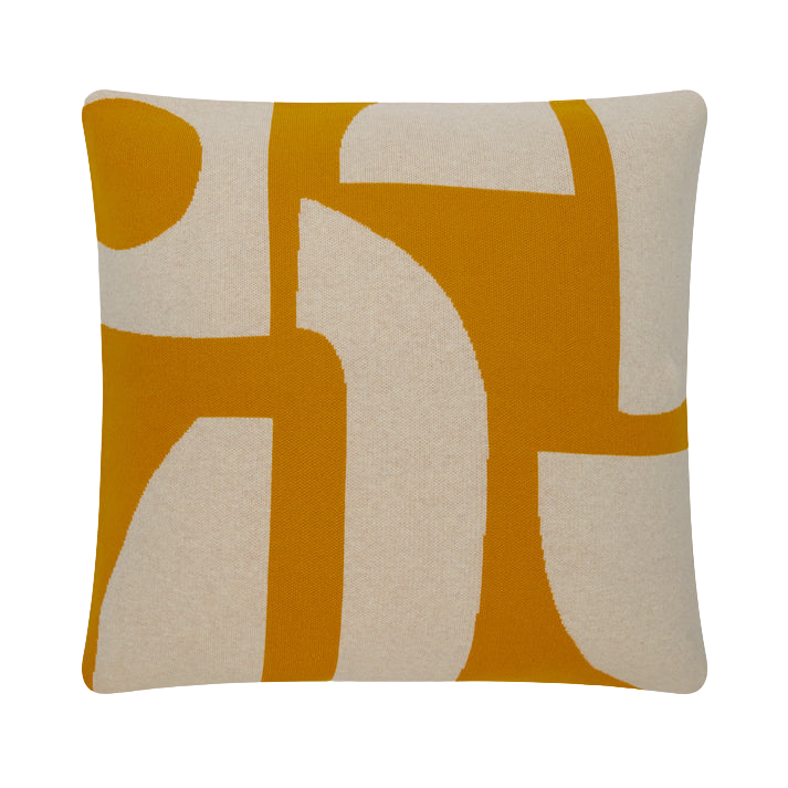 A reversible cotton knit cushion featuring a bright, bold all over design in a joyful shade of citrus.