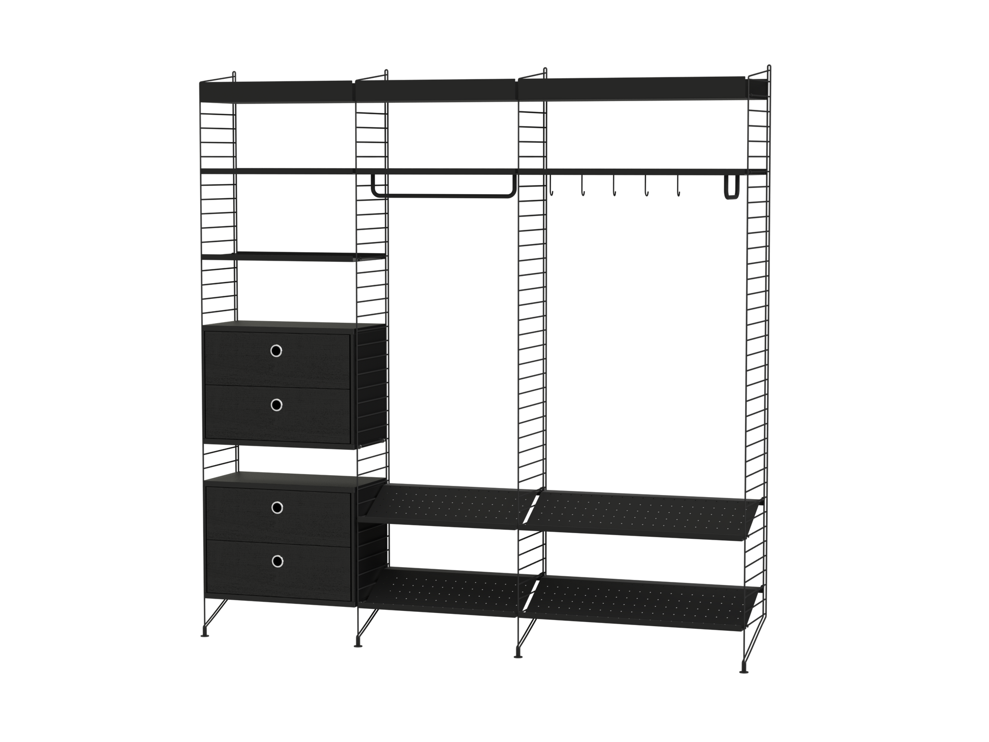 Are you blessed with a spacious hallway? Then we have the perfect solution for you. This combination truly has it all. Drawers, shoe shelves, metal shelves with high and low edge and plenty of opportunities to place the accessories, rods and hooks, wherever you prefer.