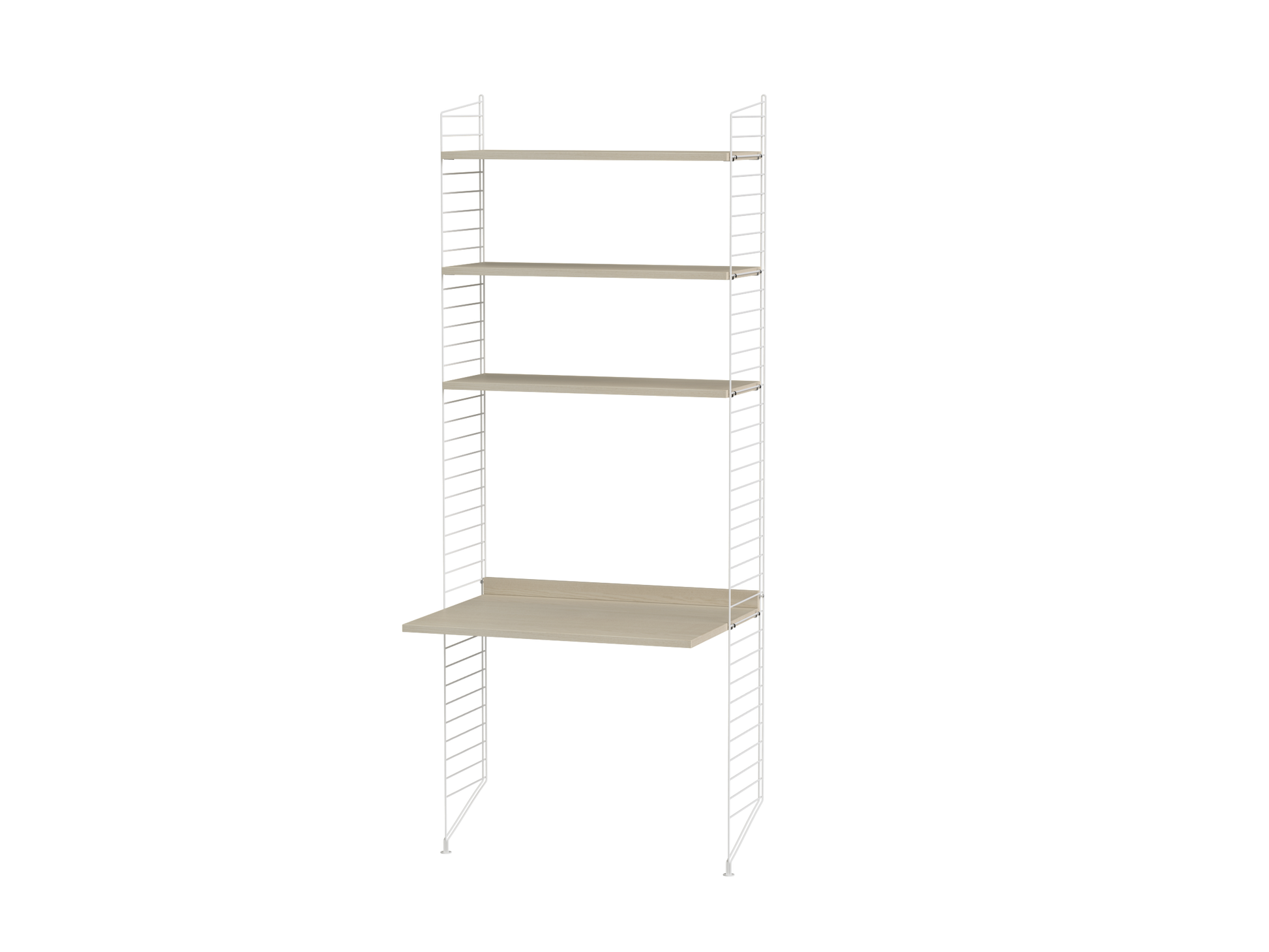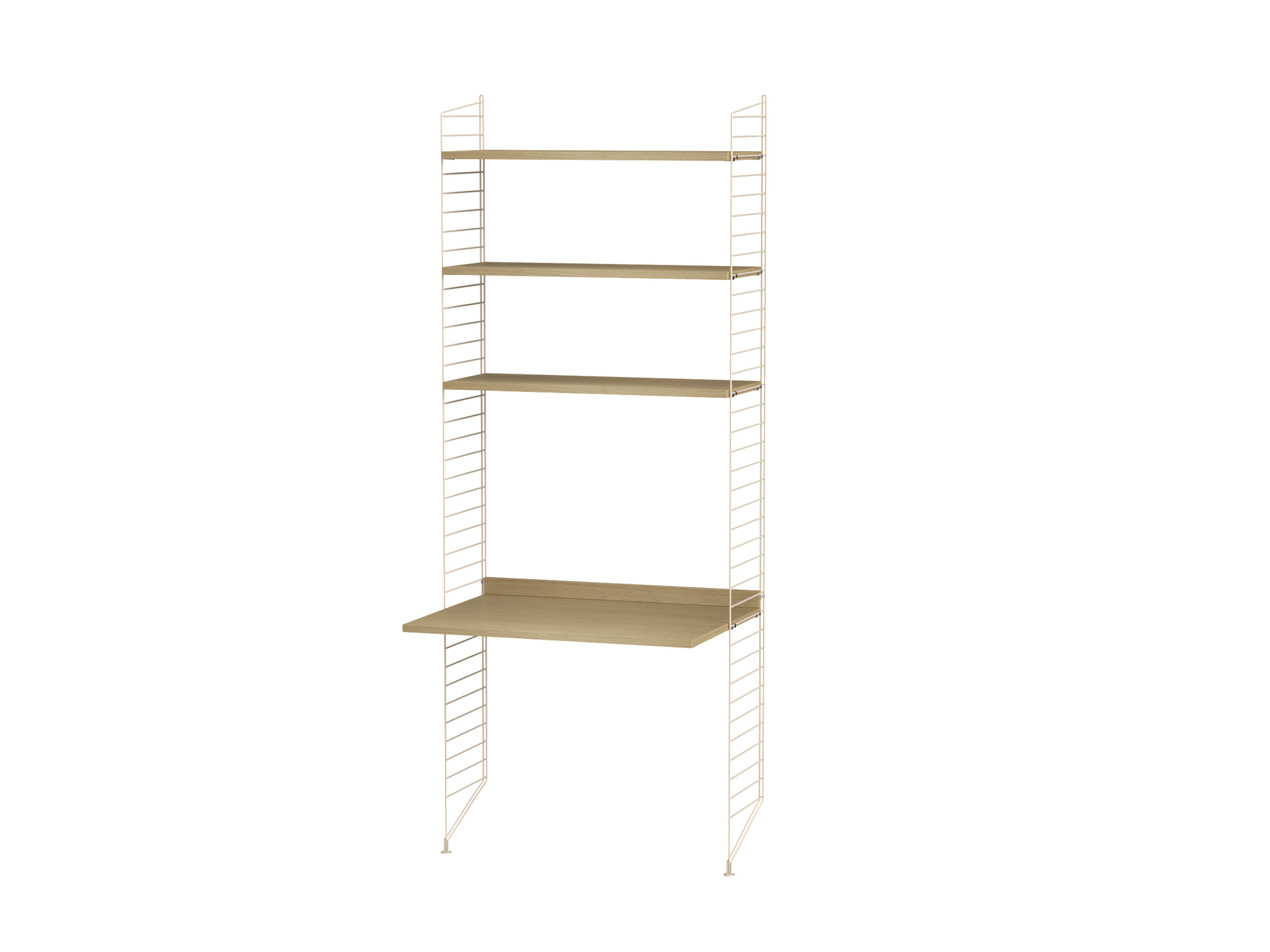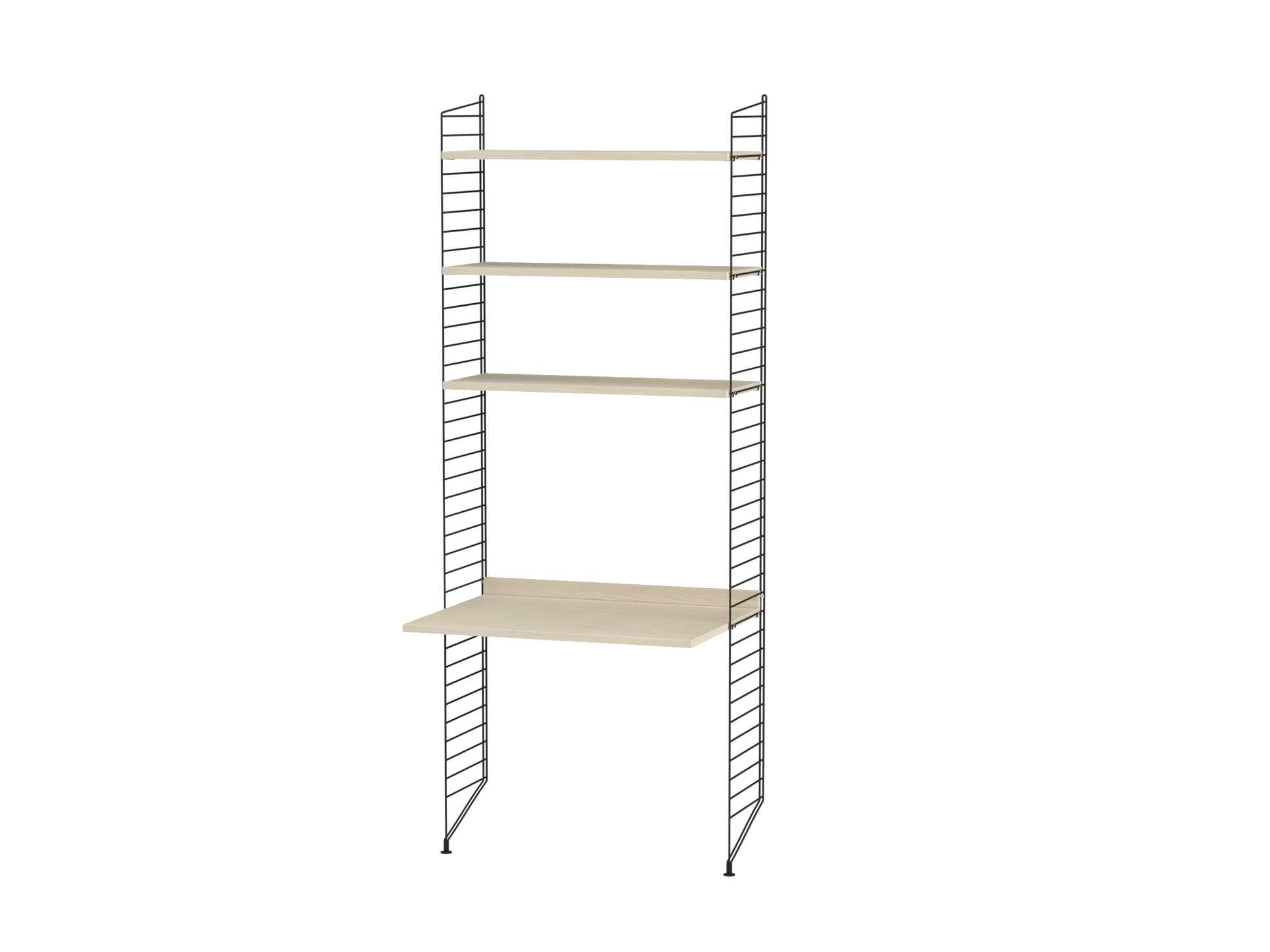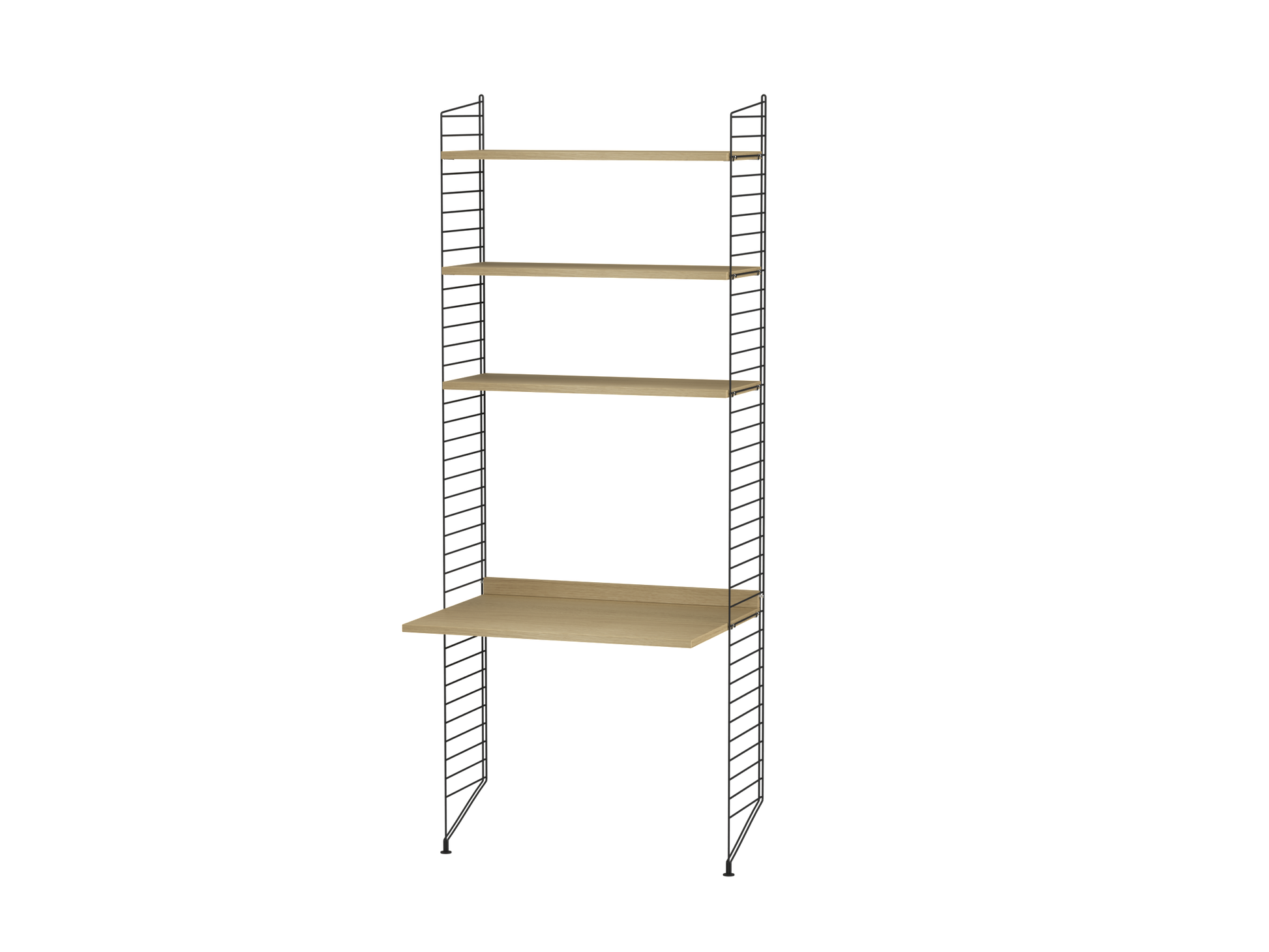 Floor mounted combination perfect for the kids room. A merge between a bookshelf and creative spot for the kids with a work desk at the bottom and shelves at the top.