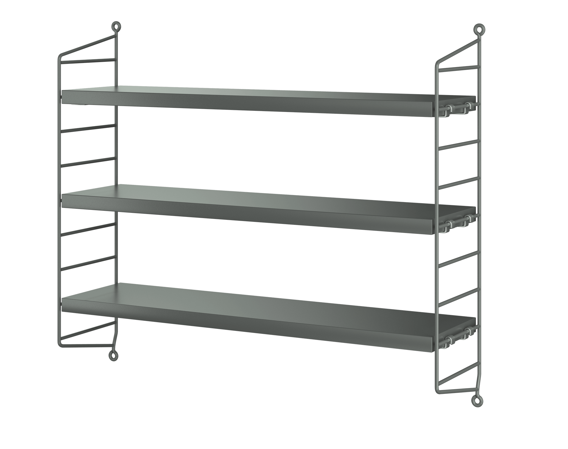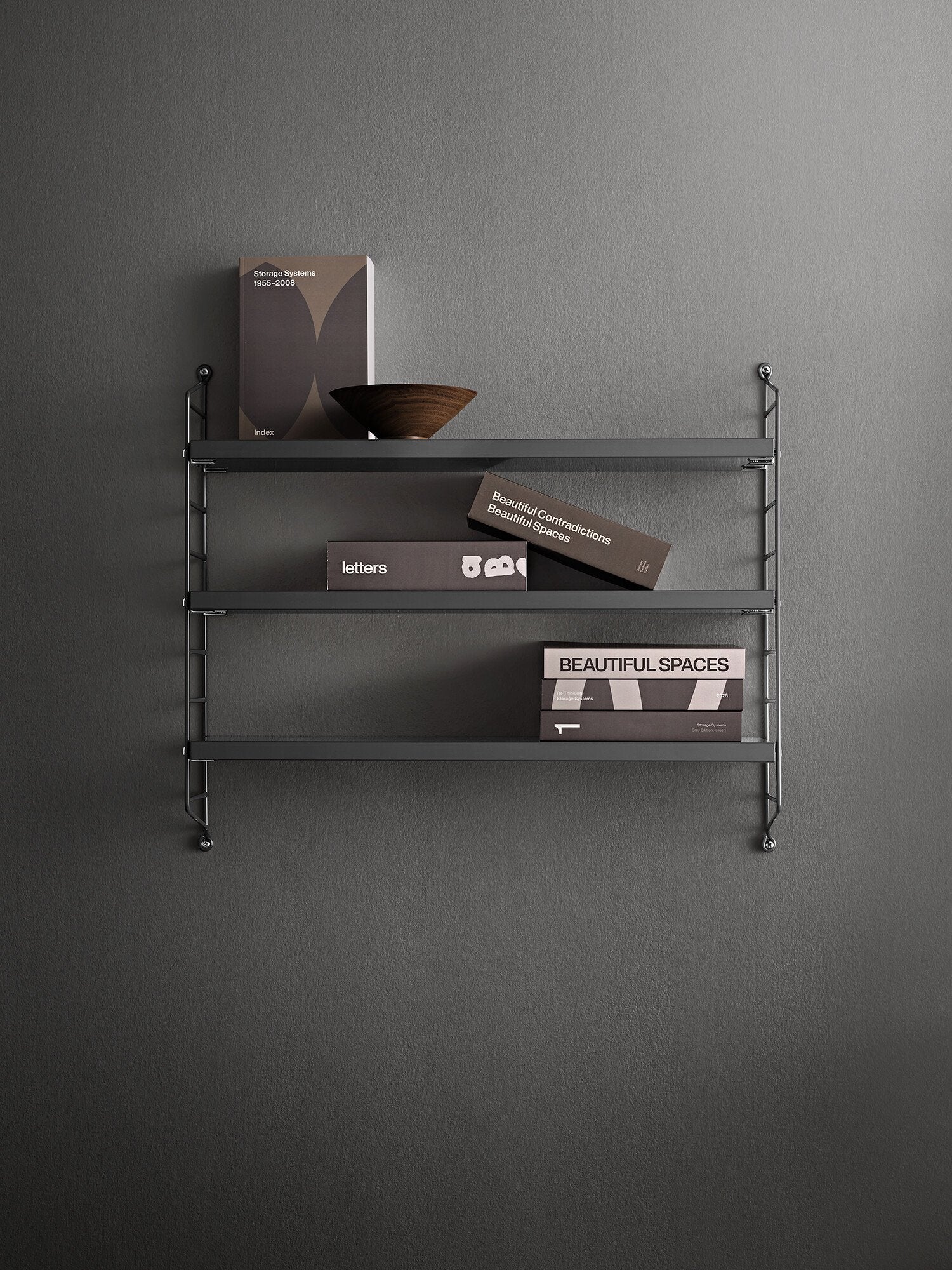 Since the shelf is neat and practical it fits equally well as a nightstand as an extra shelf in your hallway. String Pocket is sold as one complete unit containing two wire panels, height 50 cm, and three shelves, width 58 cm and depth 15 cm.