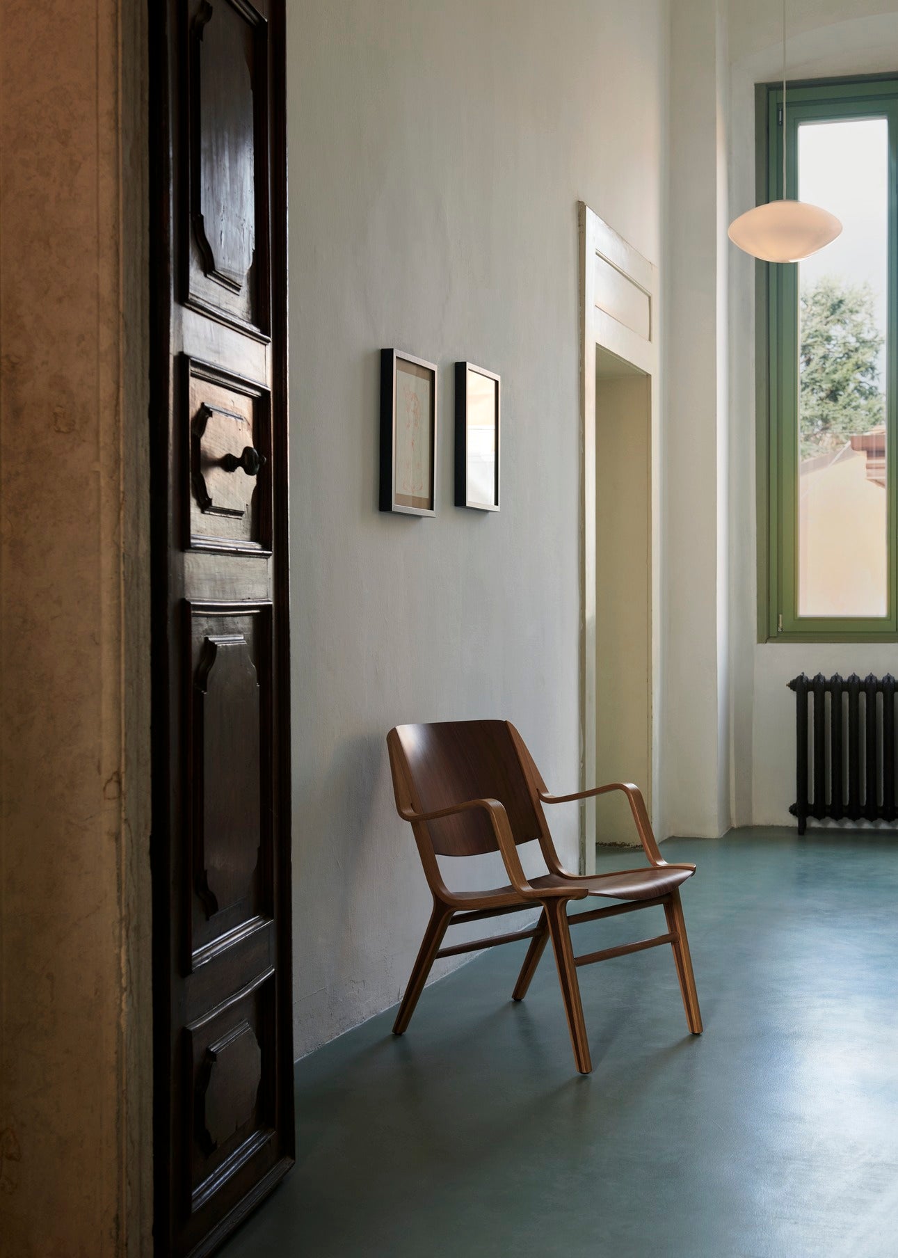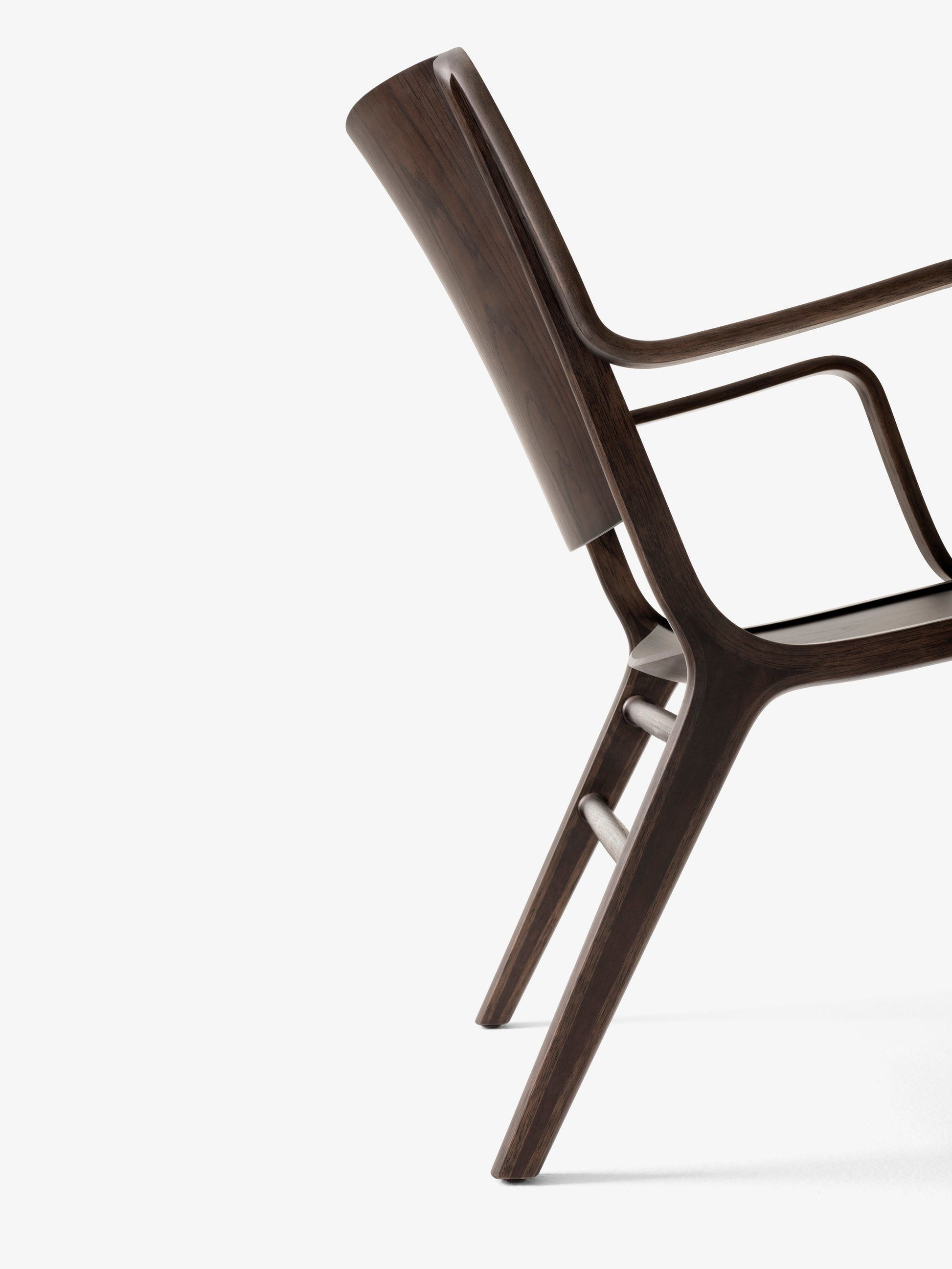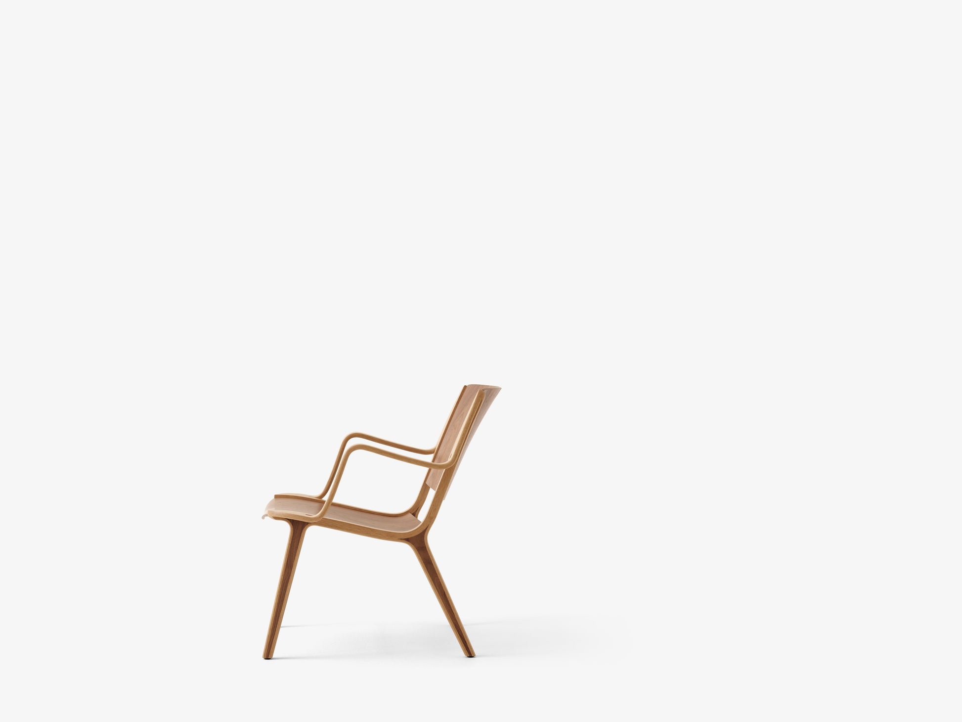 AX lounge chair represents one of the first times that plywood was shaped in 3D. The continuous curve of the armrests is mirrored in the frame, indicative of Hvidt & Mølgaard’s training in Danish cabinetry. Their expert engineering of the construction ensures unsurpassed ergonomics, resulting in the design’s reputation as the most comfortable wooden chair of its kind. Available in Lacquered Oak and Walnut or Dark Stained Oak and Walnut.