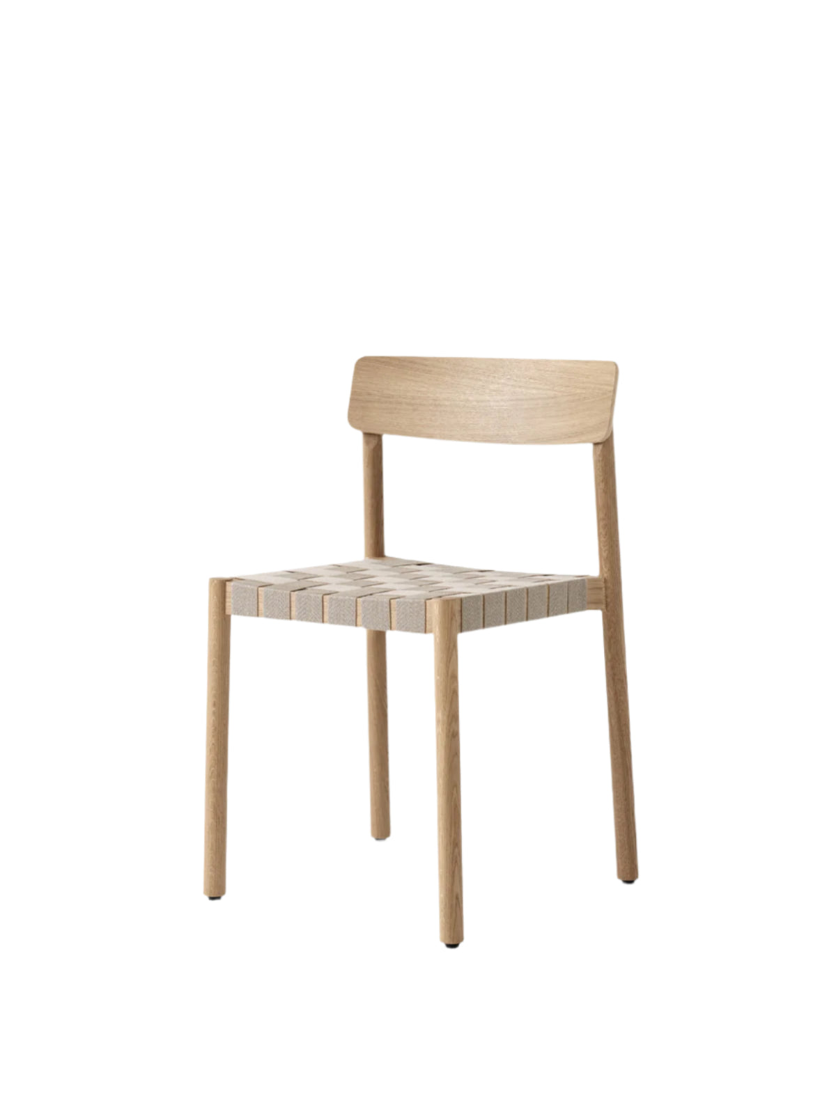 Named after the Betty Nansen theatre in Copenhagen, this stackable chair design is available in three versions: one with a linen webbed seat, one with a solid wooden seat and one with an upholstered leather seat. Betty also comes in a variety of colour combinations and materialities, making it a simple yet profoundly versatile companion to kitchen, living and dining spaces alike.